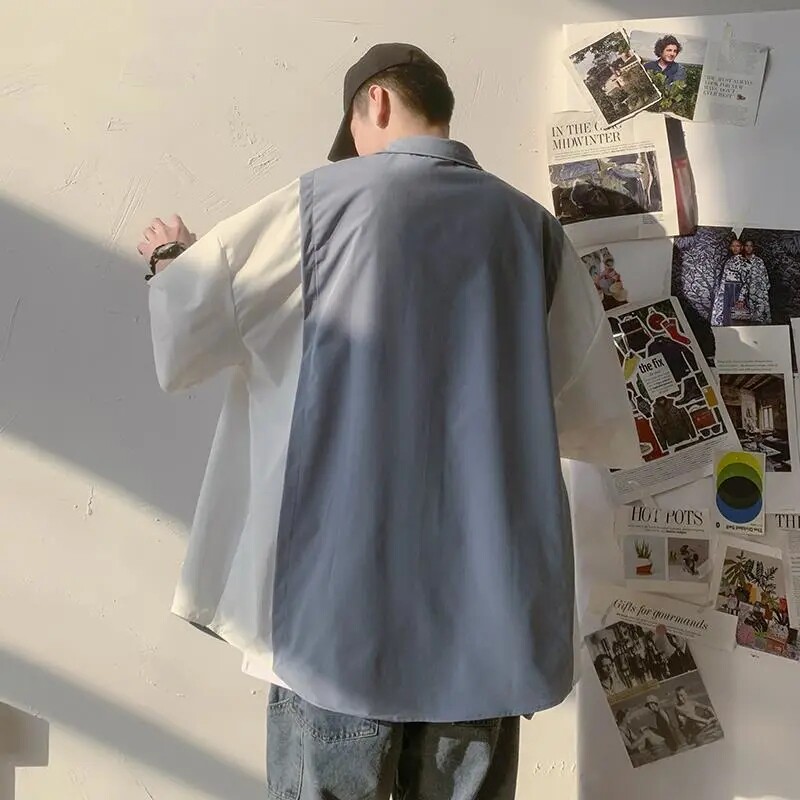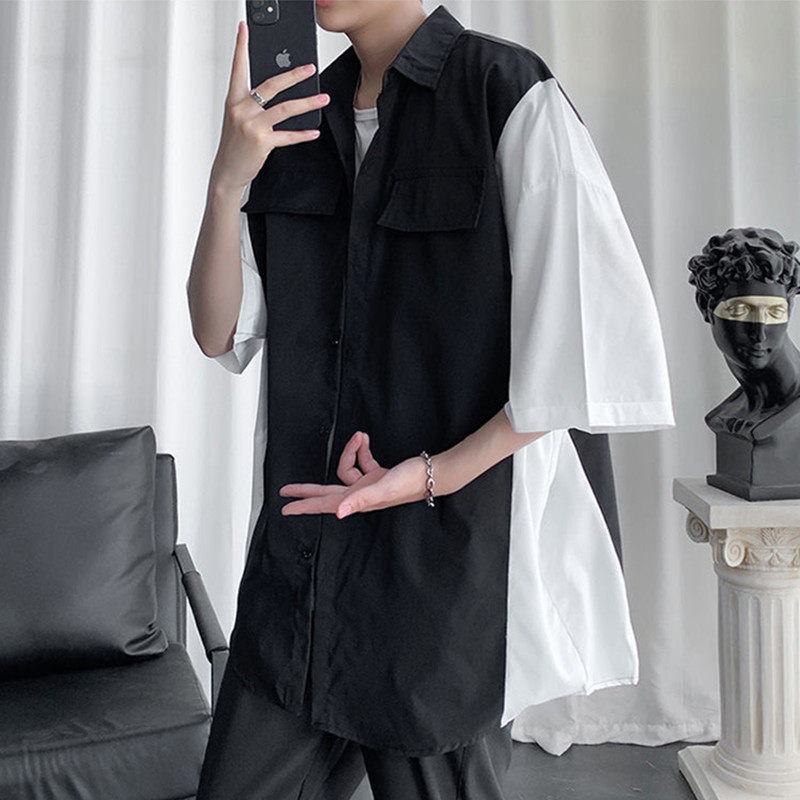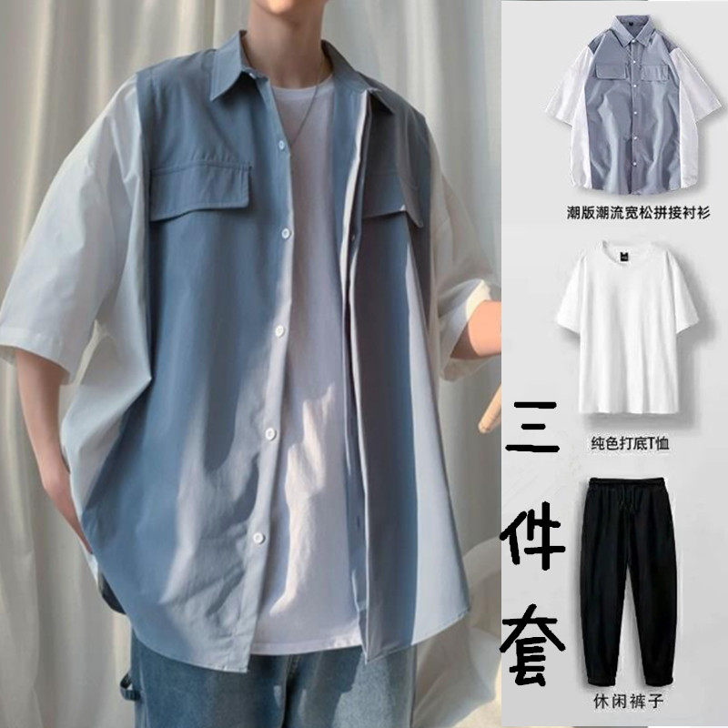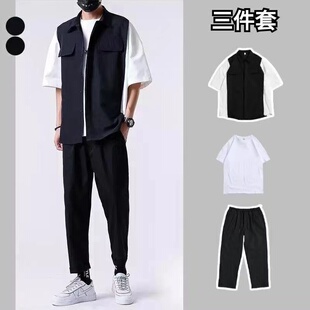 帅气短袖 夏季 潮流韩版 套装 搭配一套港风衬衣冰丝三件套 男休闲衬衫