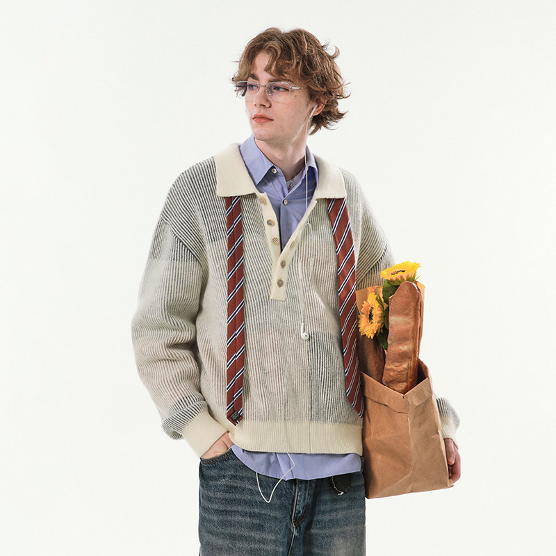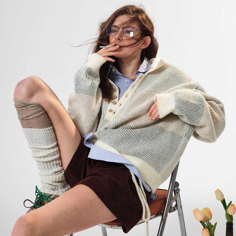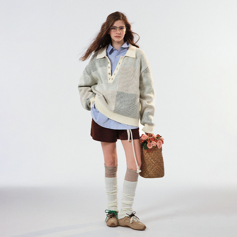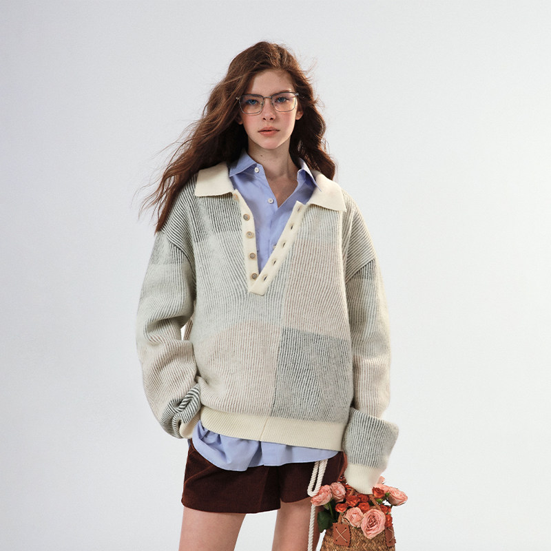 斜领设计通勤宽松百搭毛衣羊毛花纱提花Polo长袖 SINGLE MOMENT