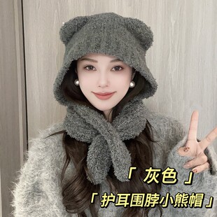 可爱小熊耳朵毛线帽子女2025秋冬季 防寒保暖毛绒绒护耳针织帽 新款