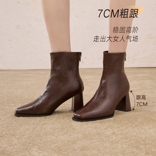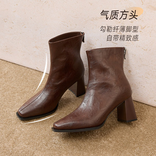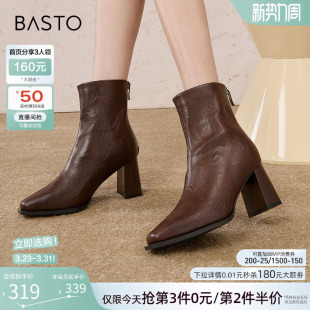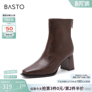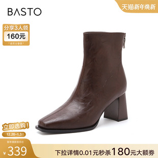 高跟鞋 方头小踝靴女鞋 加绒瘦瘦短靴M5010DD4 法式 百思图冬商场新款