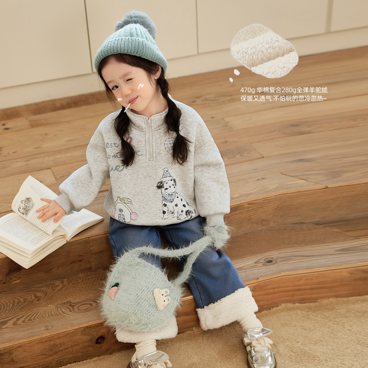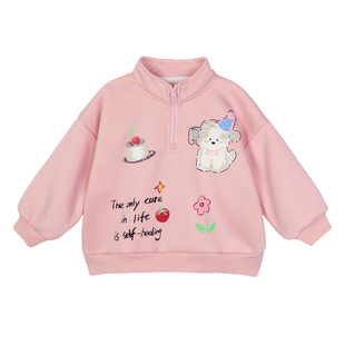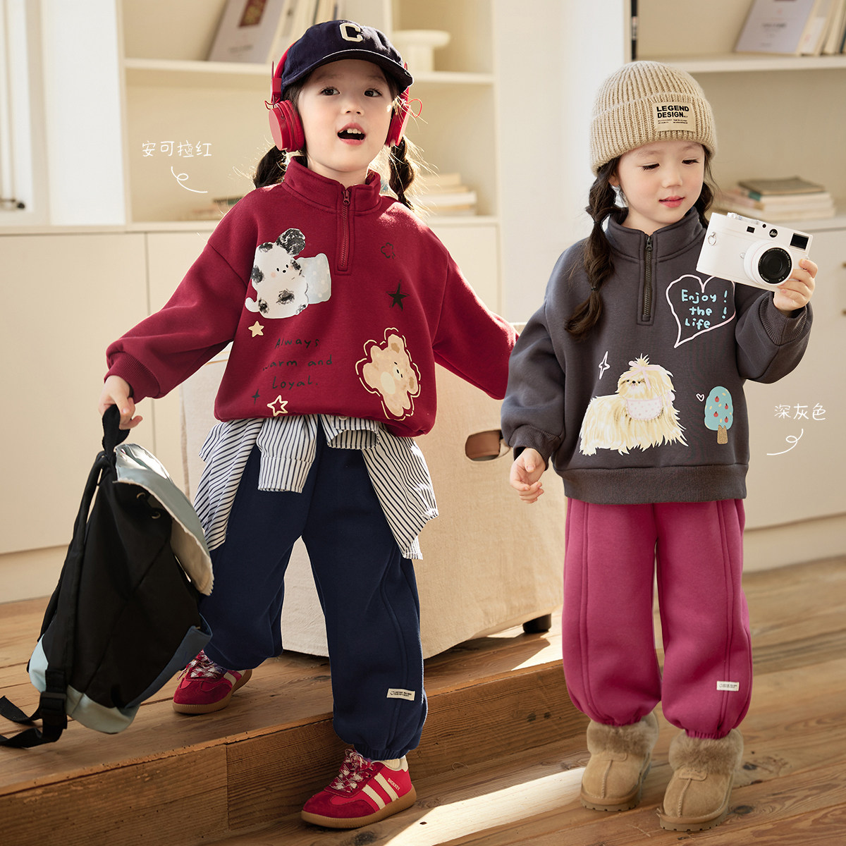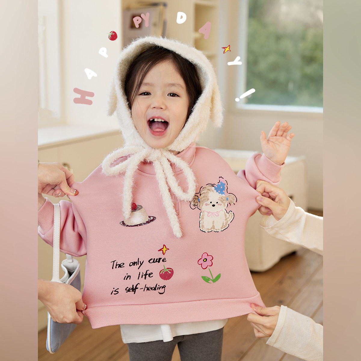 小O宝Okids童装 宝宝涂鸦立领卫衣女加绒加厚2025冬陈大猪保暖上衣
