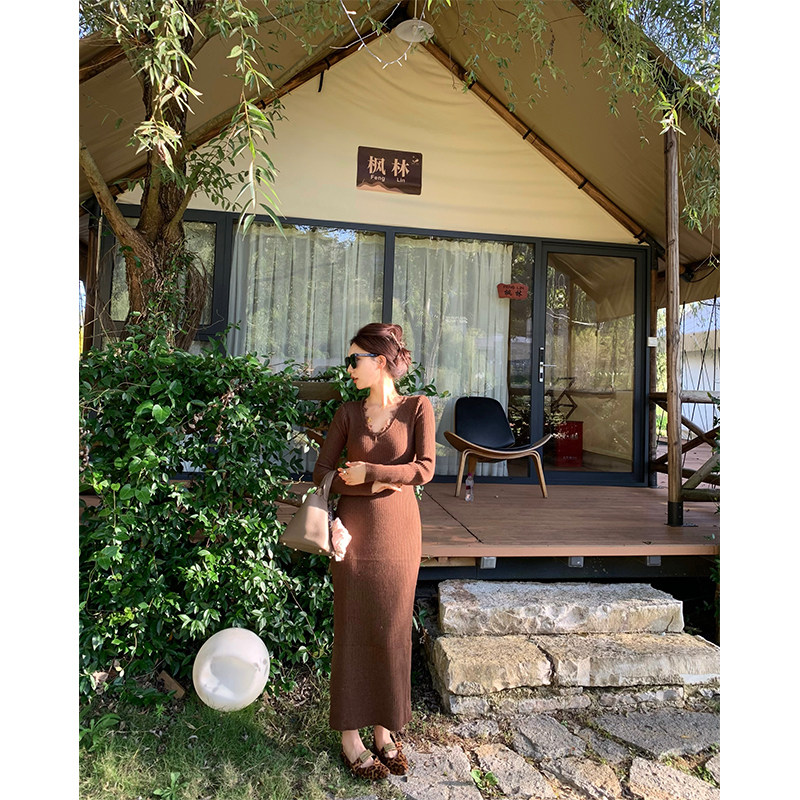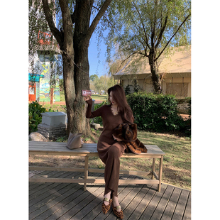 短款 DPLAY2025年冬季 修身 焦糖色连衣裙女法式 好看针织连衣裙 新款