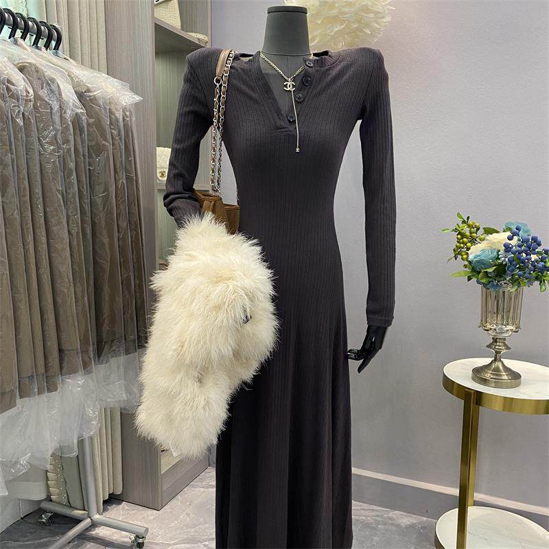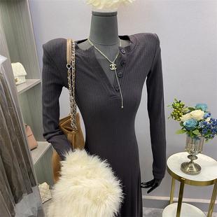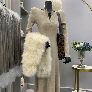 2022秋冬新款 收腰显瘦a字针织连衣裙短裙女 复古V领麻花纹灯笼袖