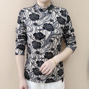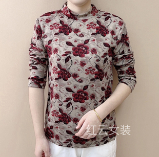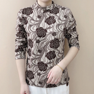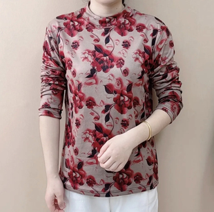 T恤女士半高领一体绒弹力打底衫 2024秋新印花长袖 洋气妈妈装 时尚