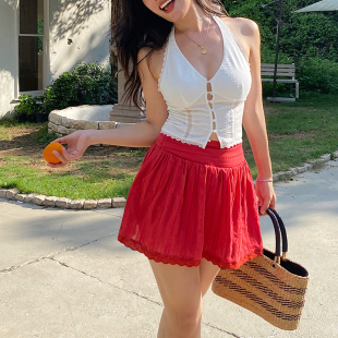 半身裙套装 ooh 蕾丝拼接V领上衣 复古橘红色两件套法式 itch痒痒