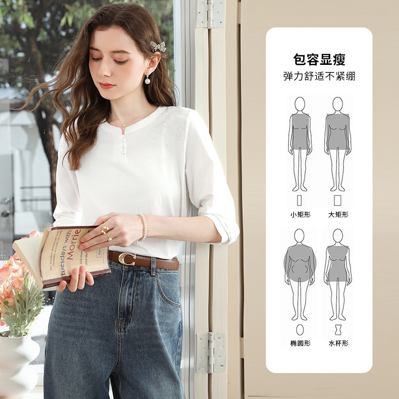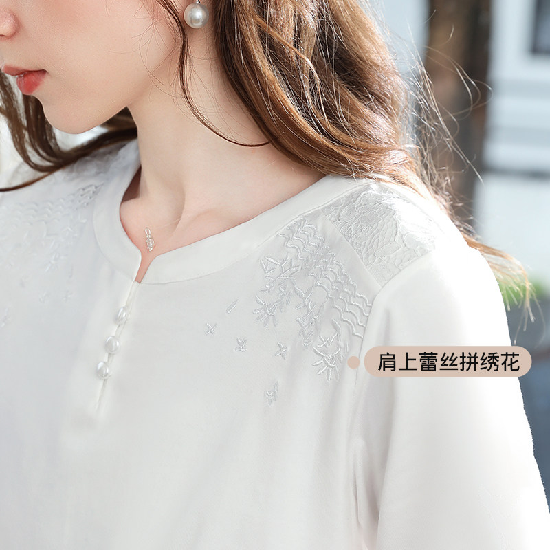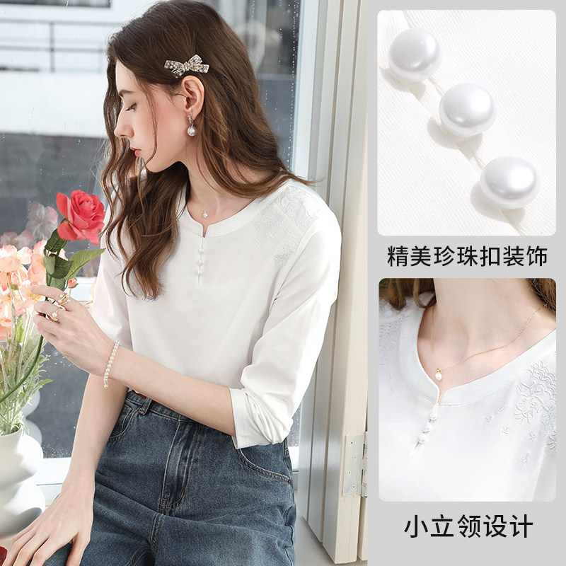 气质 新款 艾蓓怡白色蕾丝拼接刺绣立领正肩长袖 T恤上衣女2026春季