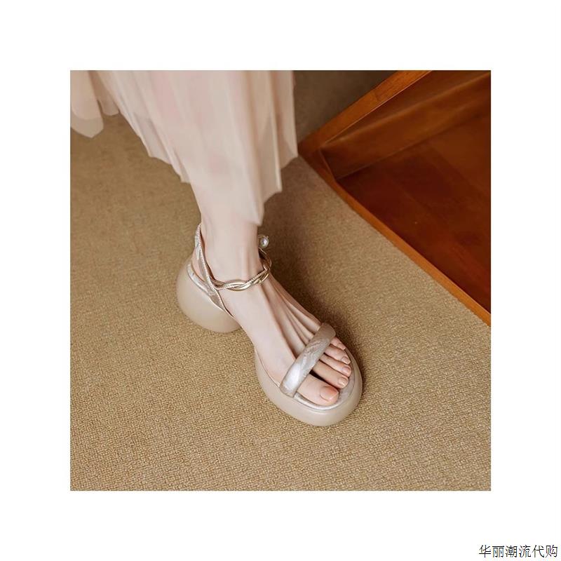 香港真皮凉鞋 女松糕厚底露趾罗马2025夏小个子百搭粗跟一字沙滩鞋