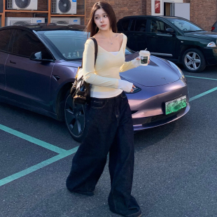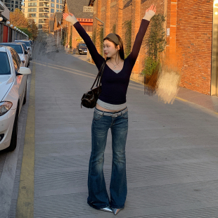 显瘦撞色拼接百搭长袖 E7Q8 t恤女修身 辣妹假两件长袖 内搭上衣 美式
