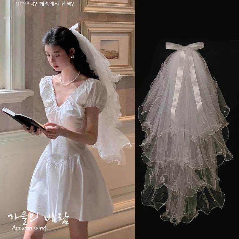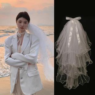 森系甜美头纱领证白色蝴蝶结珍珠发饰小众新娘结婚演唱会拍照道具