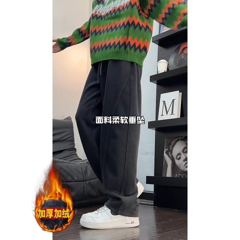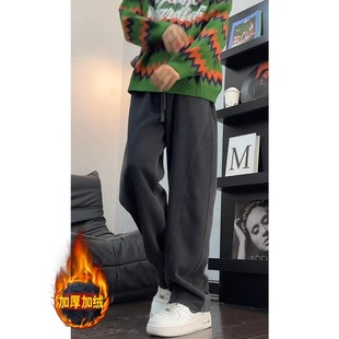 子垂感重磅休闲直筒长裤 灰色加绒弯刀卫裤 复古运动裤 秋冬美式 男款