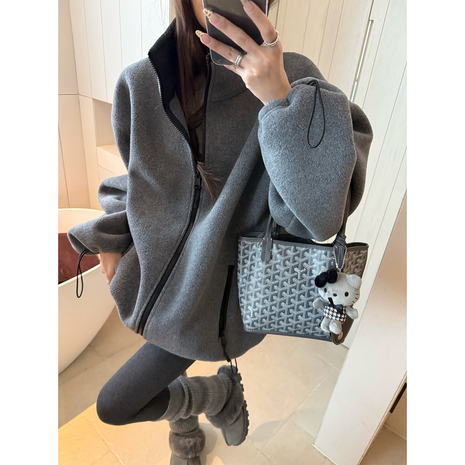 superniniyy 拉链卫衣外套女 盐系加厚双面摇粒绒灰色宽松立领长袖
