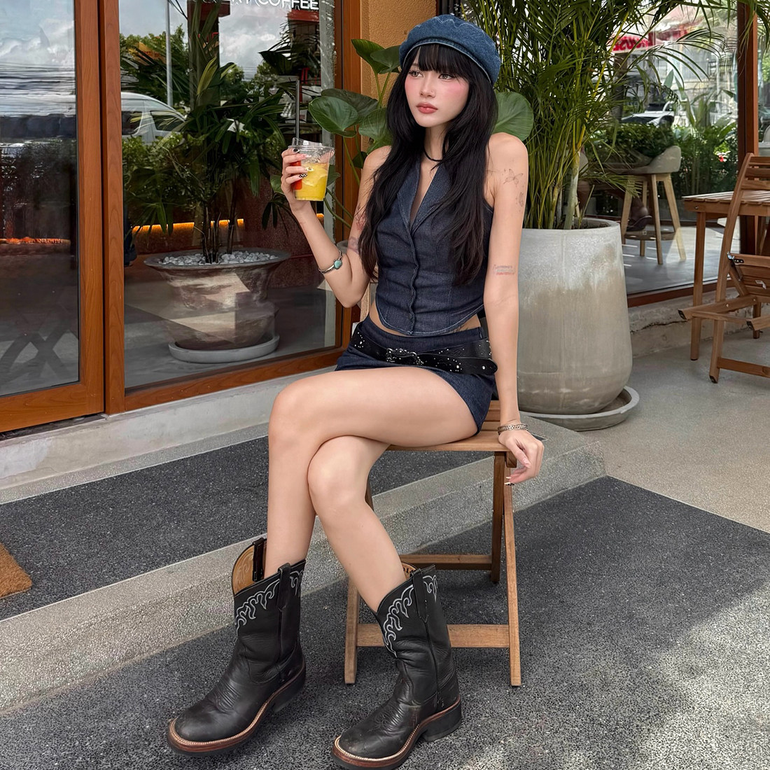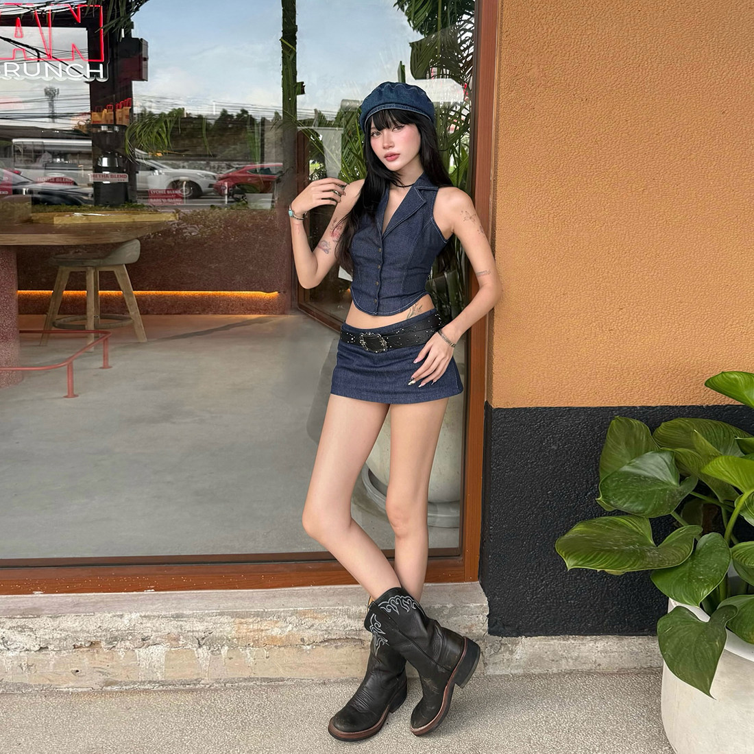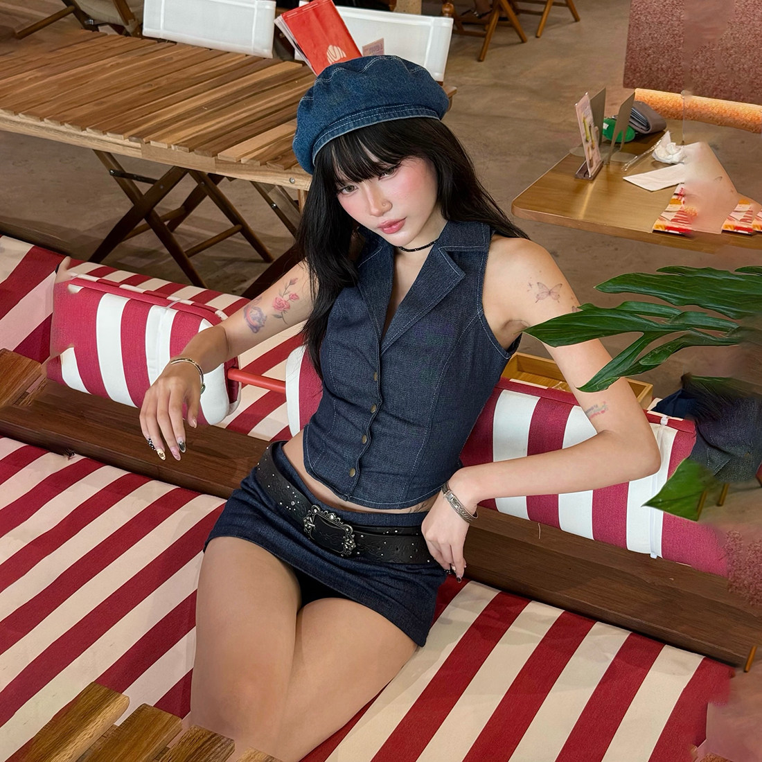 背心高腰百搭牛仔半身裙两件套女 辣妹风显瘦露脐无袖 SylCue 美式