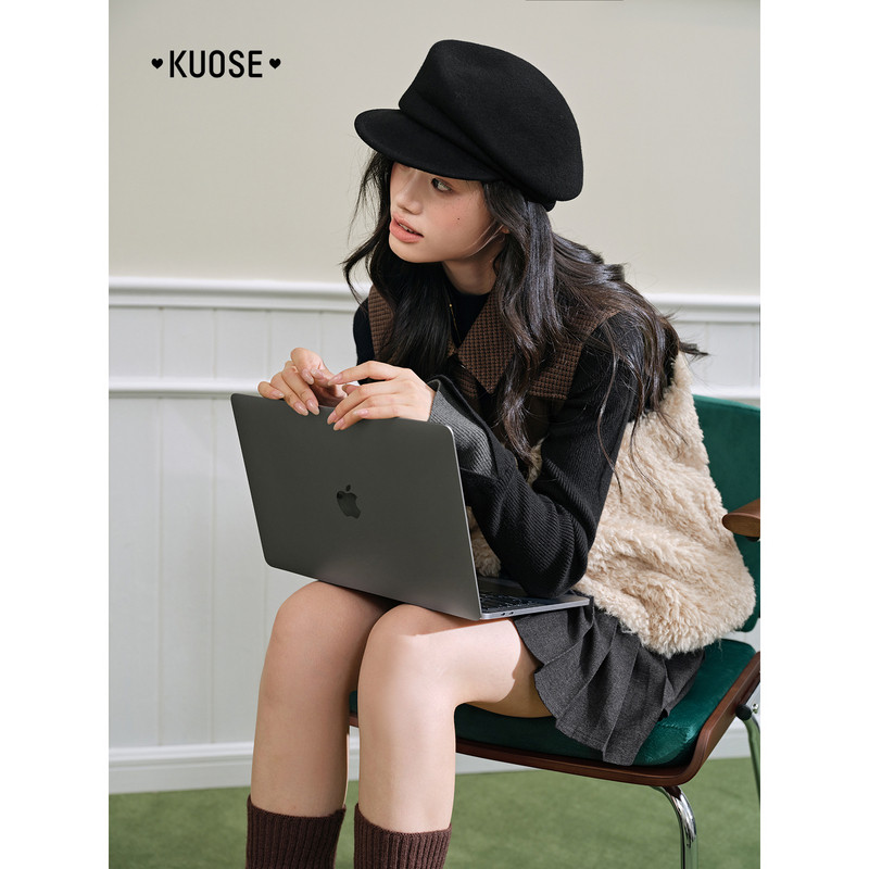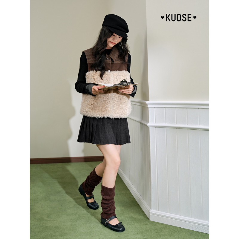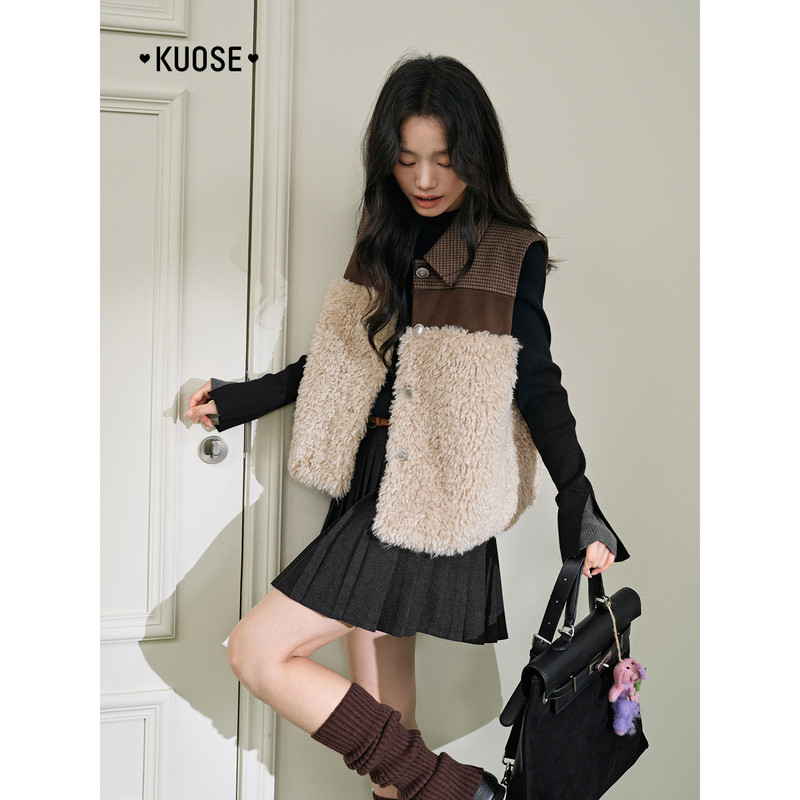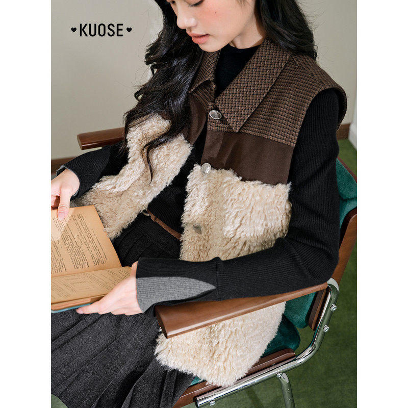 新款 2025秋冬季 叠穿背心夹克 外套女装 阔色深杏色毛绒拼接马甲开衫