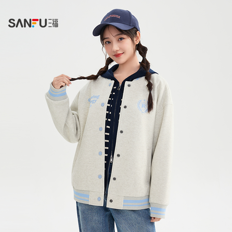 509713 英文刺绣撞色宽松学院风棒球服女装 三福厚外套2025新款 冬季