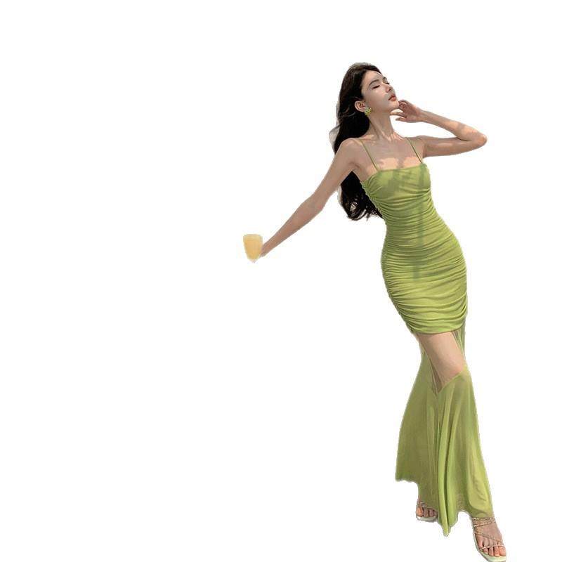 MULVAN 蝴蝶印花网纱吊带连衣裙女度假风收腰气质长裙 清冷氛围感