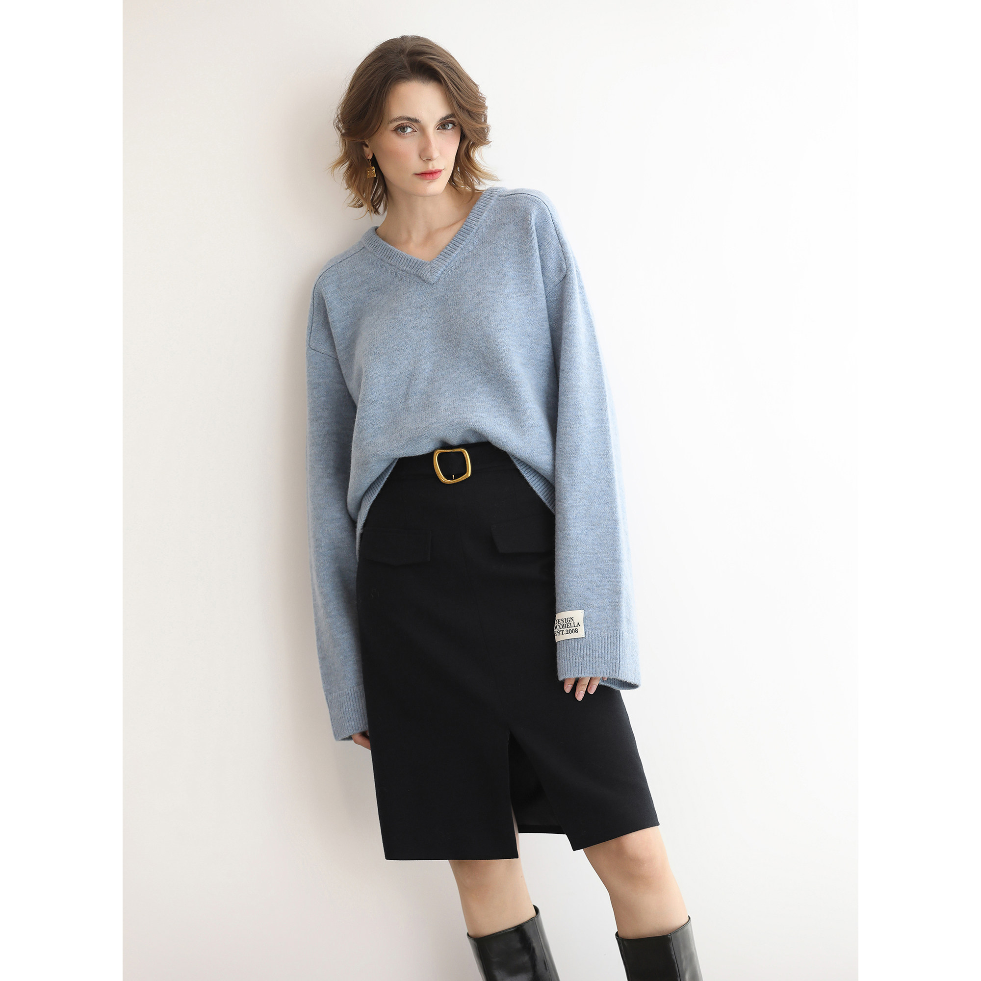 圆领100%纯山羊绒衫 灰色宽松打底上衣 女毛衣秋冬假两件拼色针织衫