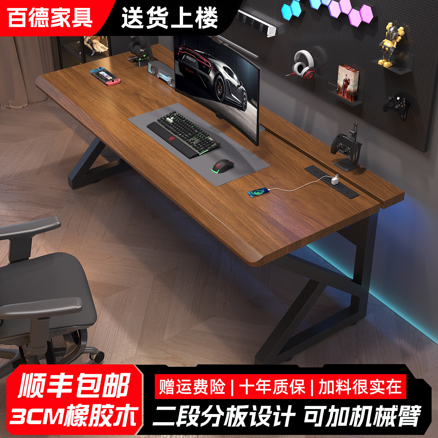 实木电脑桌家用办公桌书桌卧室可夹机械臂二段分板电竞桌台式 双人