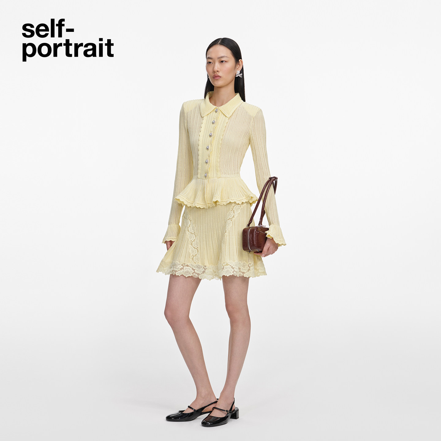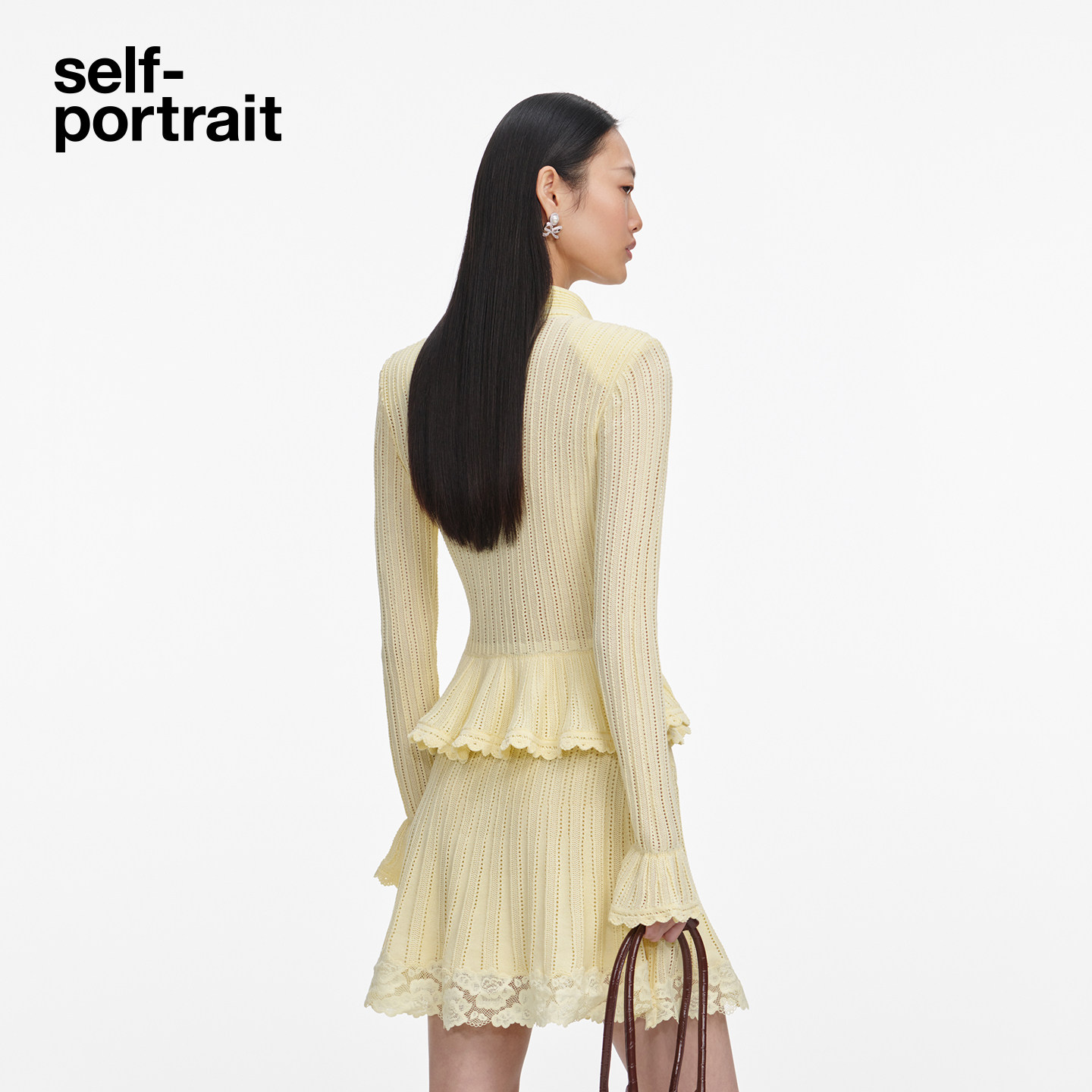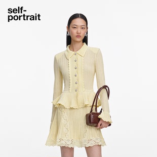 奶油黄翻领钻饰针织蕾丝拼接连衣裙 2026春夏新款 self portrait