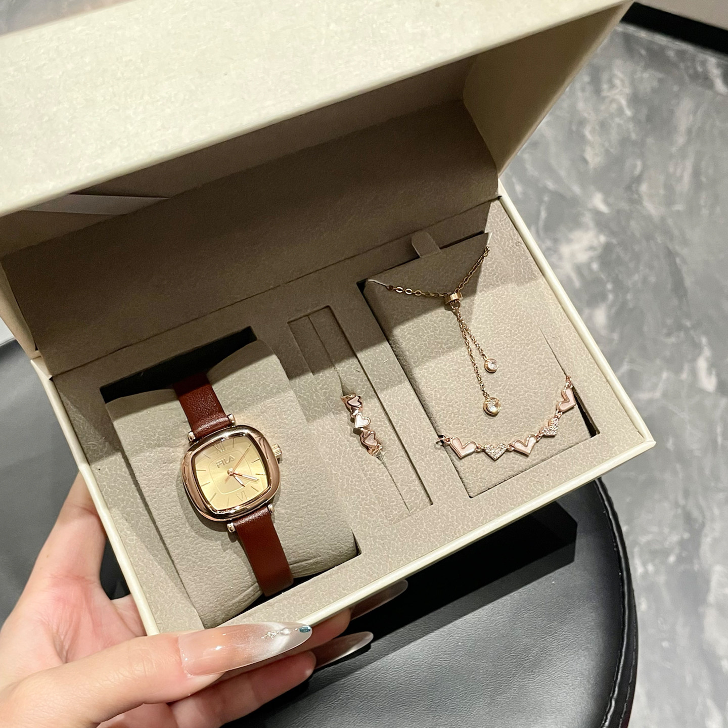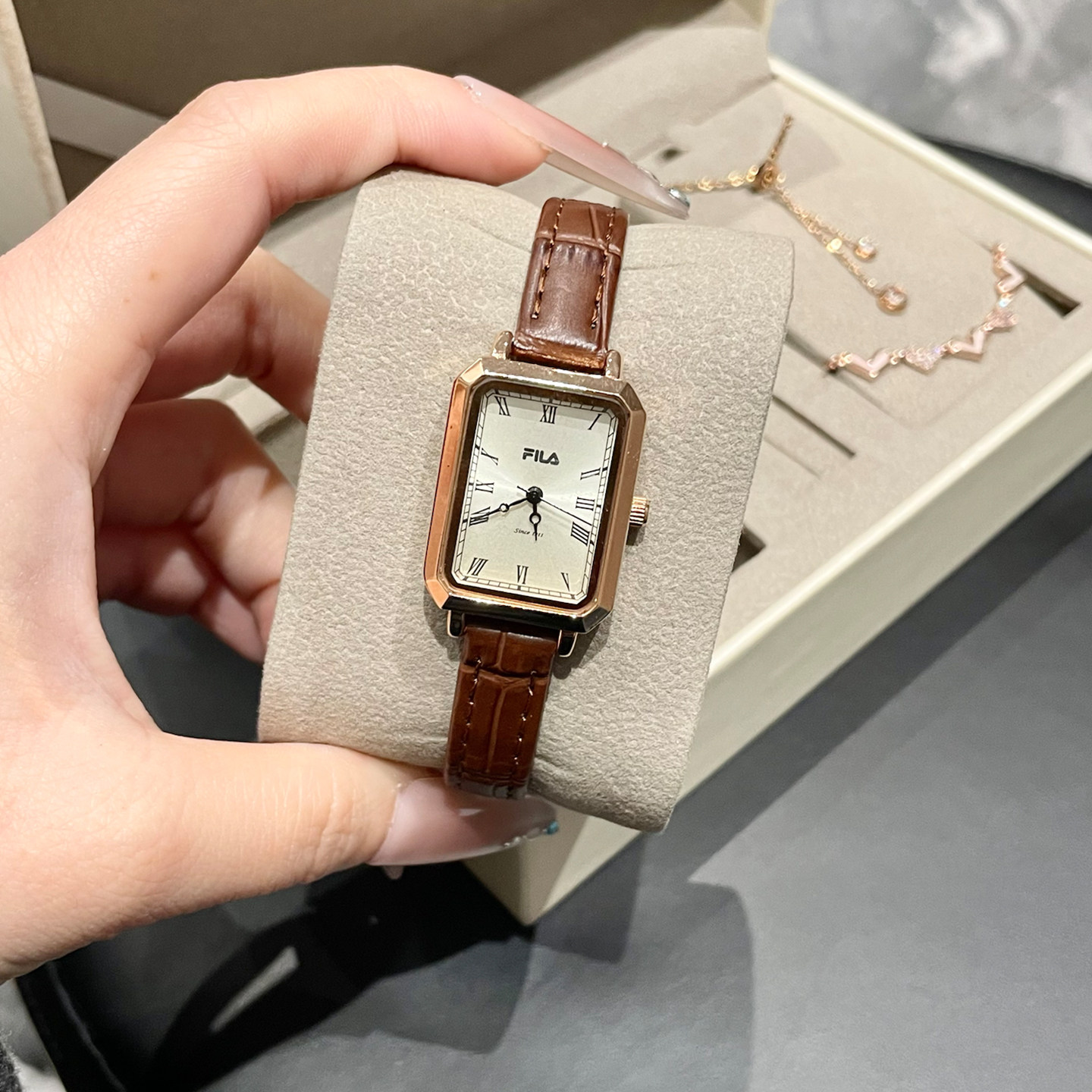 FILA斐乐女士手表复古小方表棕色皮带轻奢小众腕表女款 生日送礼物