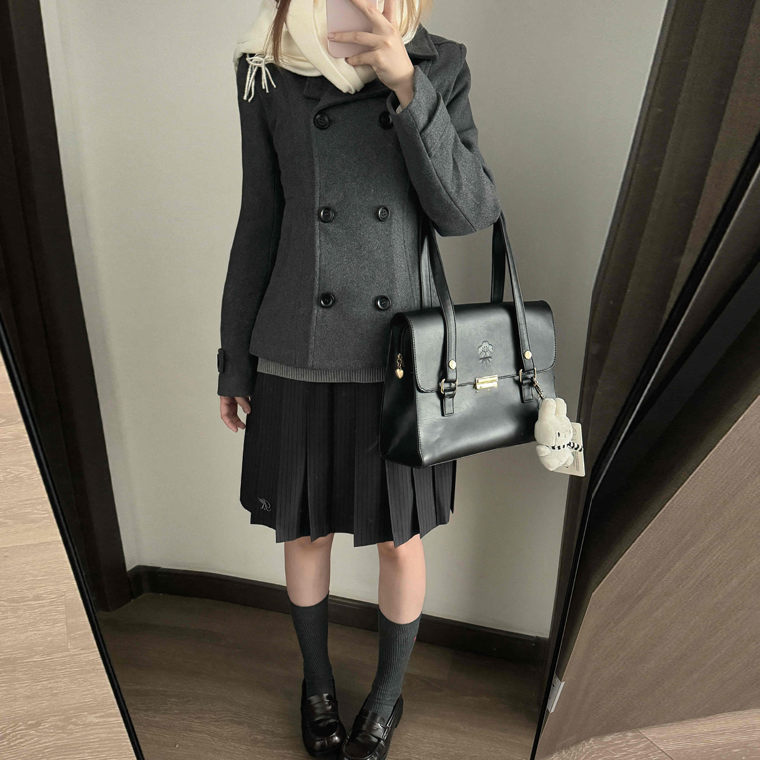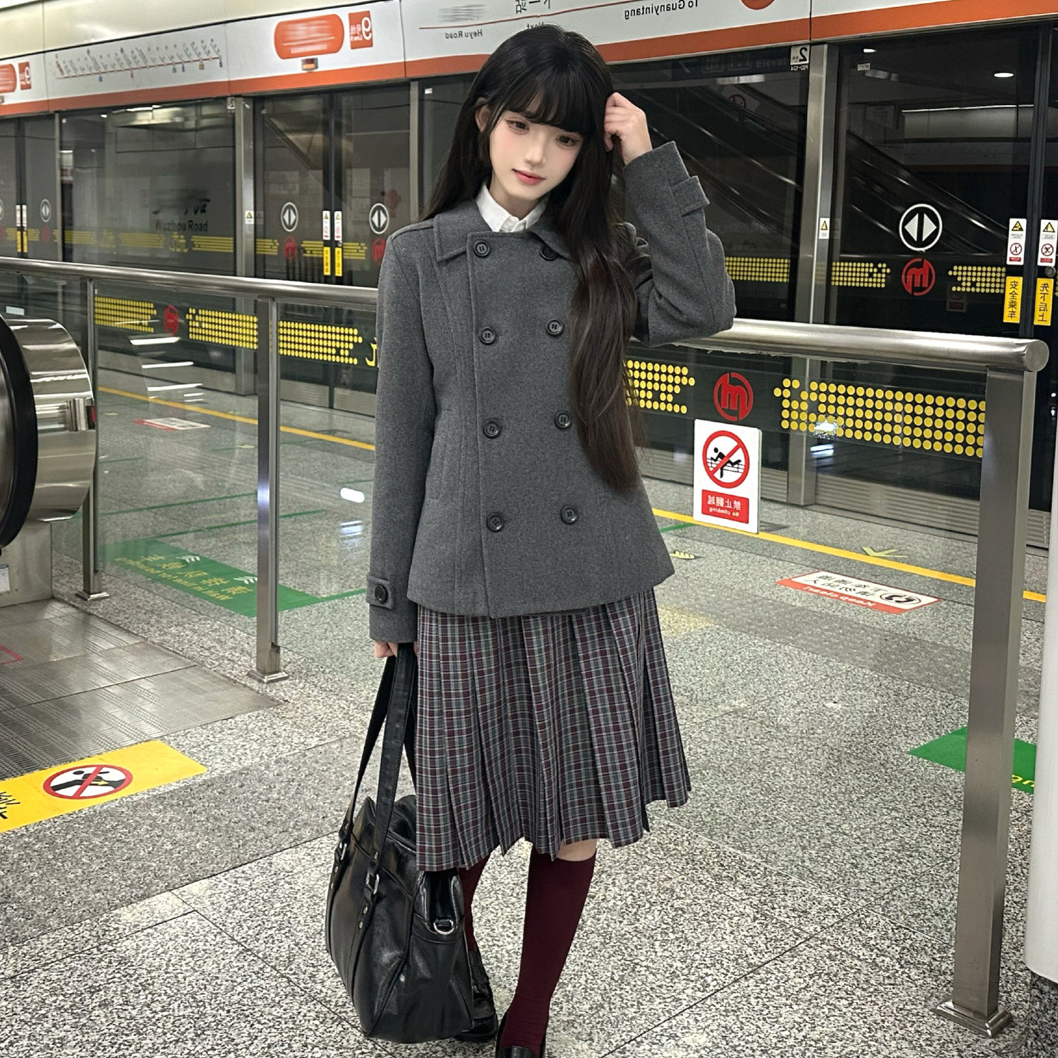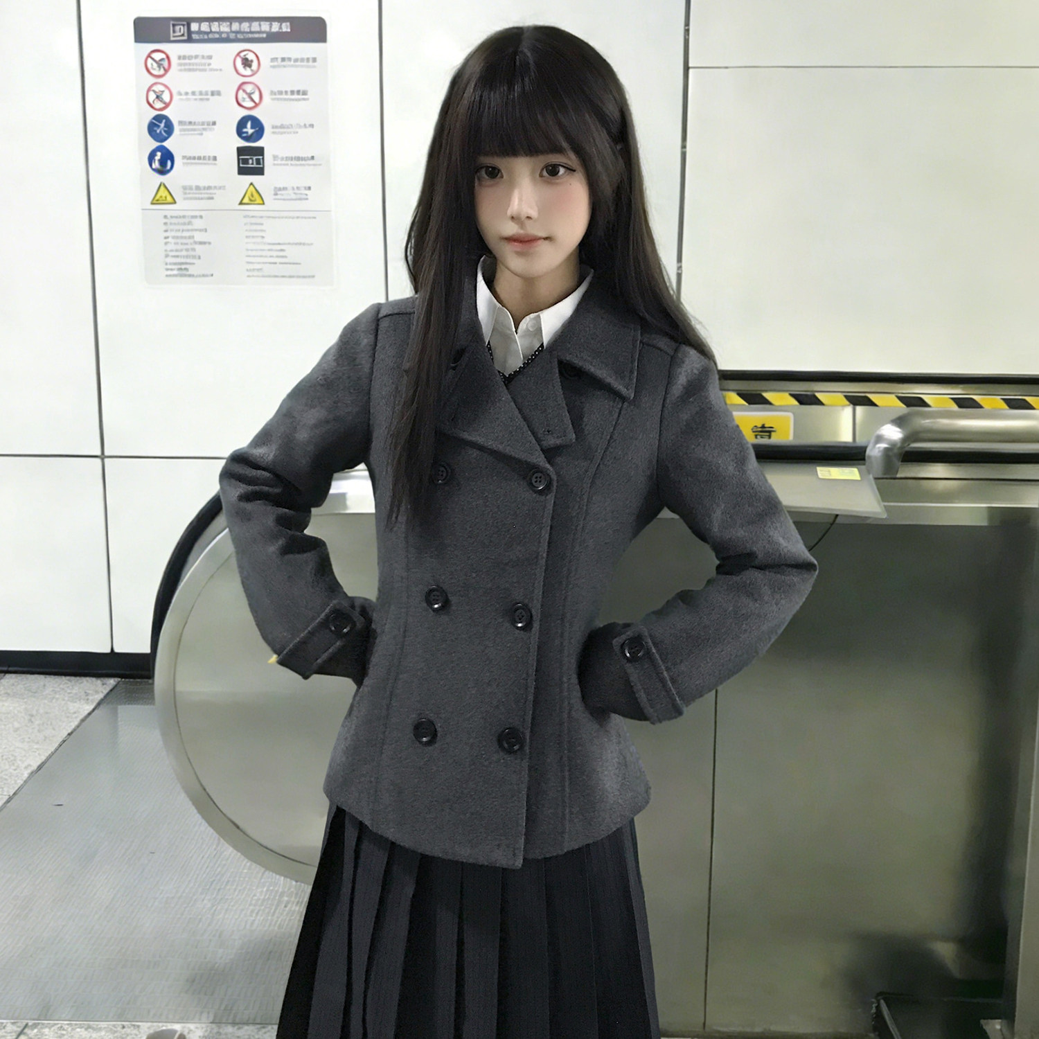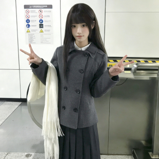 花千猪50羊毛 日系双排扣短上衣jk制服灰色翻领呢外套 绒雪集大衣