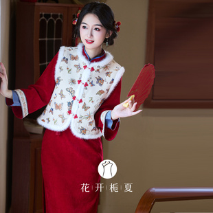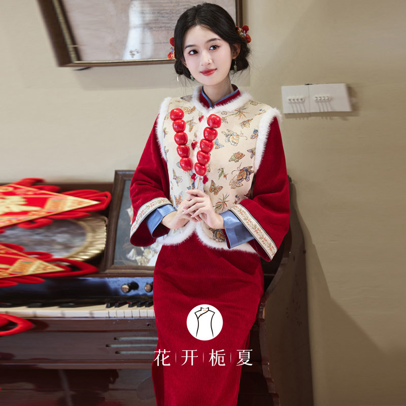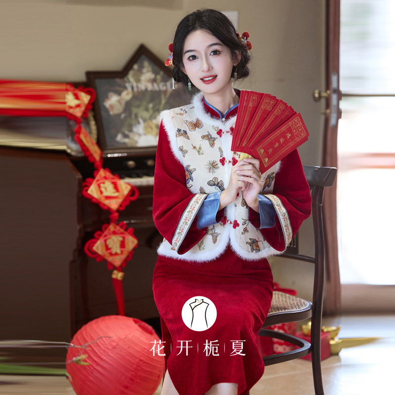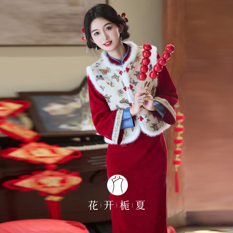 红色新中式 秋冬敬酒服国风两件套女加绒加厚拜年服 旗袍2025年新款