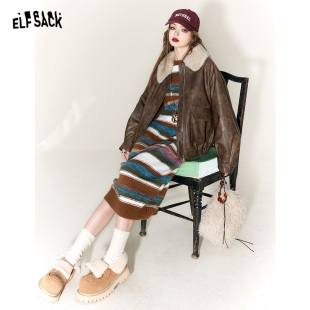 妖精 宽松显瘦针织长裙 口袋复古撞色条纹连衣裙女2026年春秋新款
