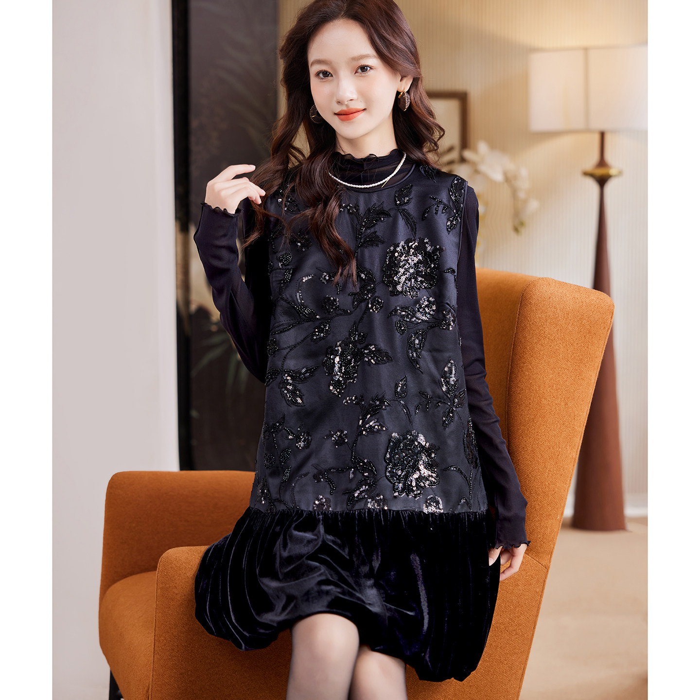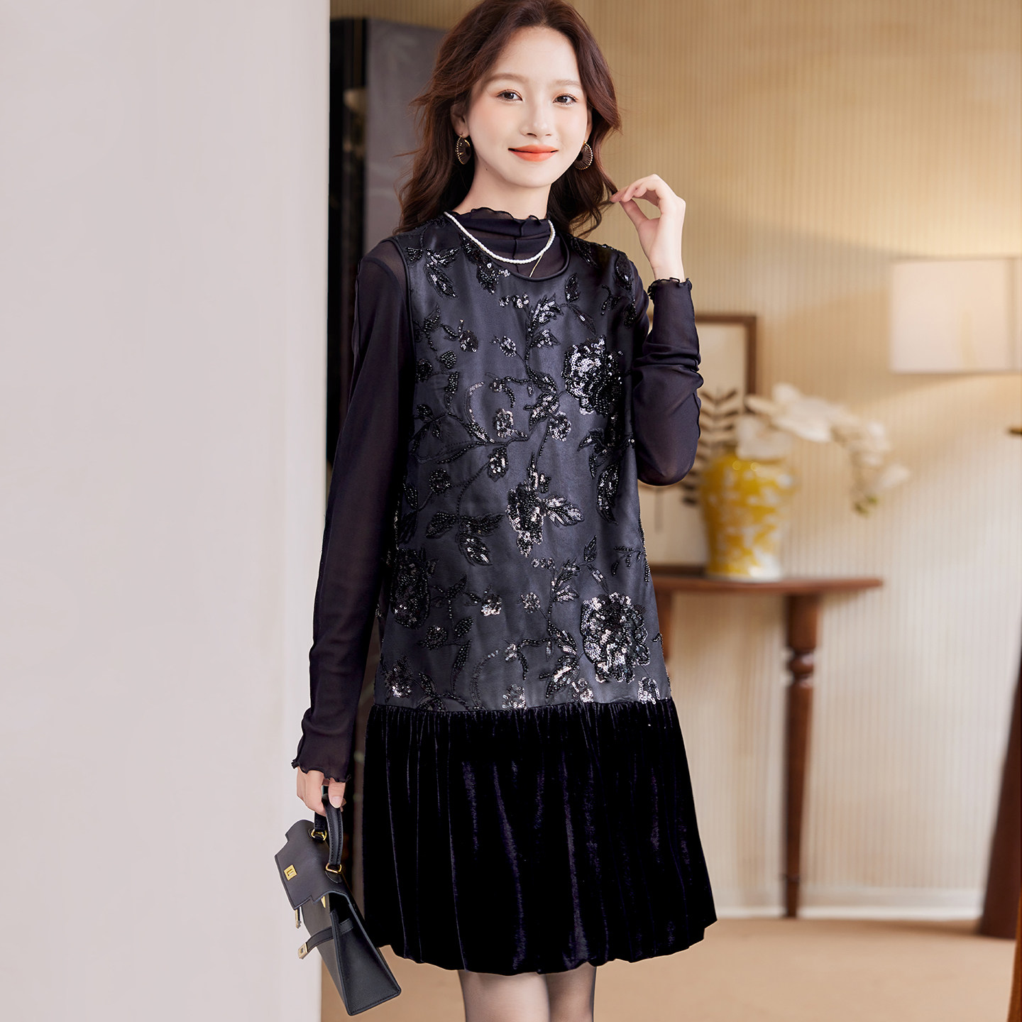 宝诗黎重工钉珠亮片背心裙2026早春新款 气质韩系优雅休闲连衣裙