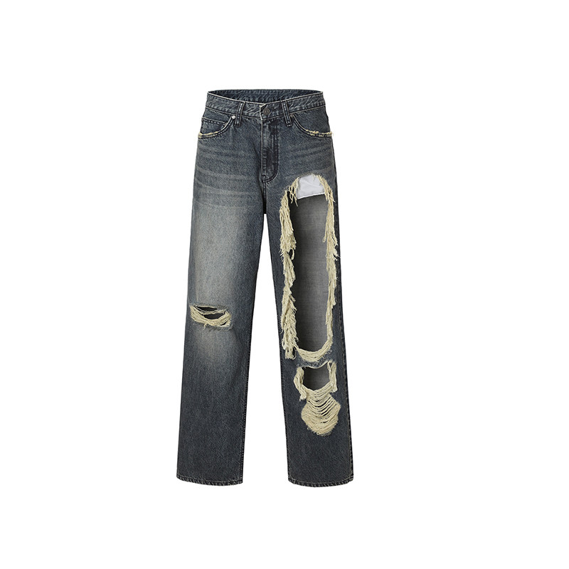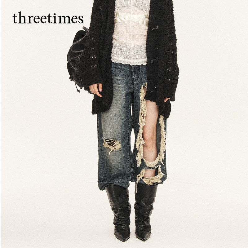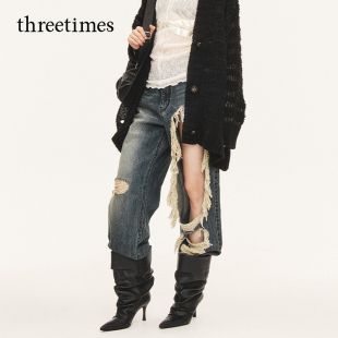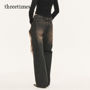复古潮酷长裤 女2026美式 子 水洗直筒破洞牛仔裤 threetimes明星同款