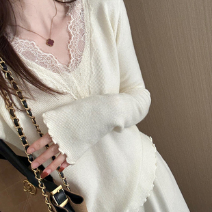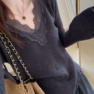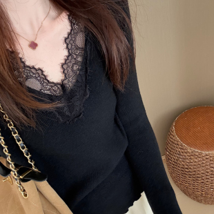 韩版 话里基础款 新款 2026春季 简约风内搭上衣女 纯色V领蕾丝打底衫