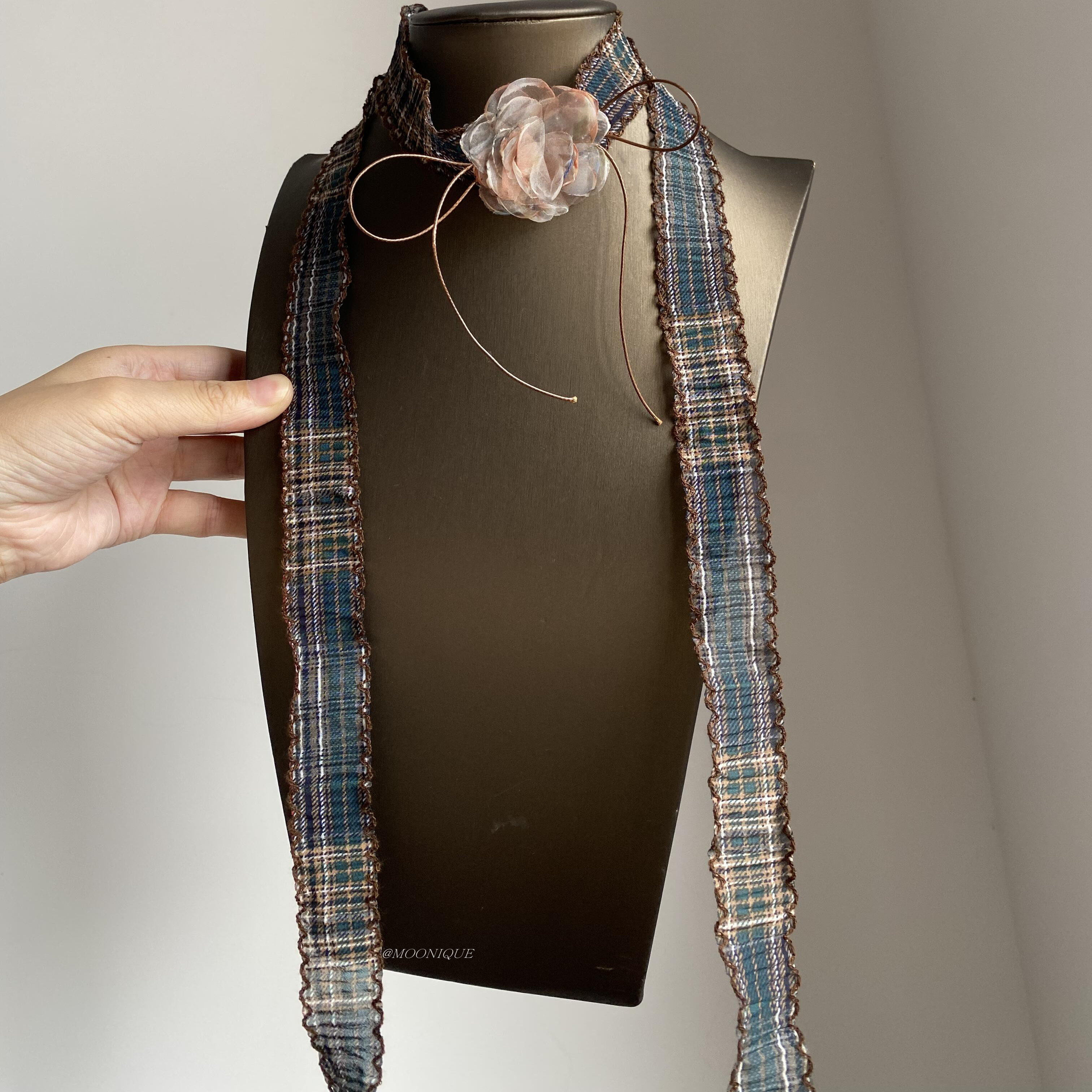 长款 饰时尚 毛衣链配饰 复古美拉德格纹蕾丝花朵丝巾轻薄围巾装 新款