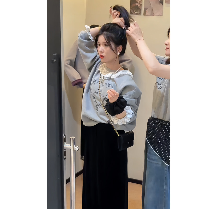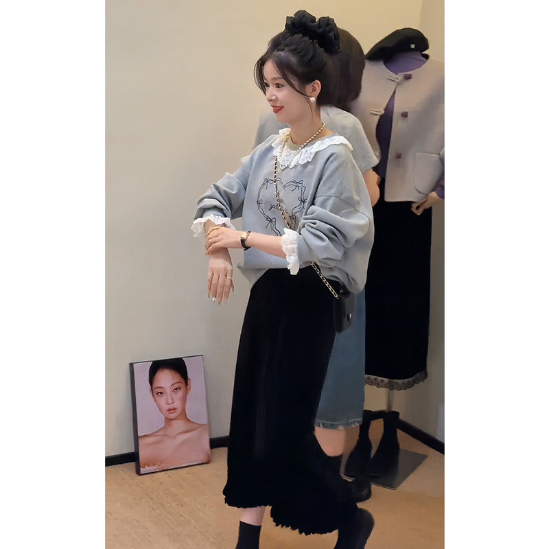 韩系穿搭秋季 蕾丝花边拼接印花卫衣半身裙两件套 气质减龄百搭套装