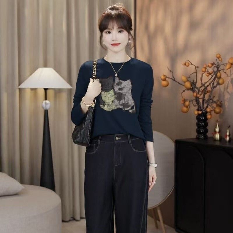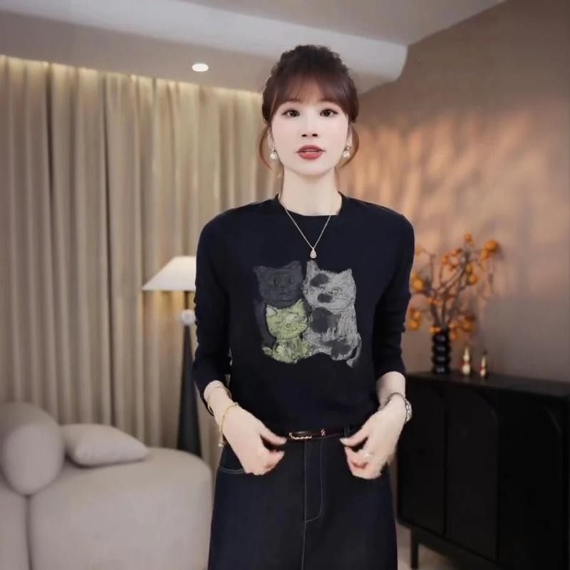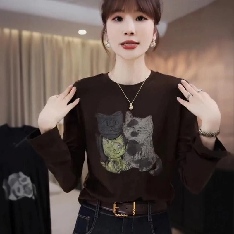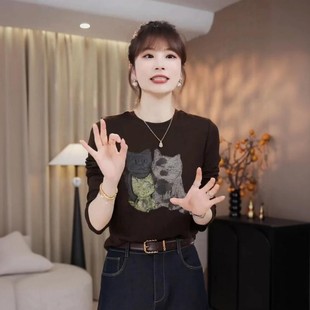 洋气打底衫 小猫印花上衣长袖 欧货女装 新款 潮 T恤女欧洲站2025秋装