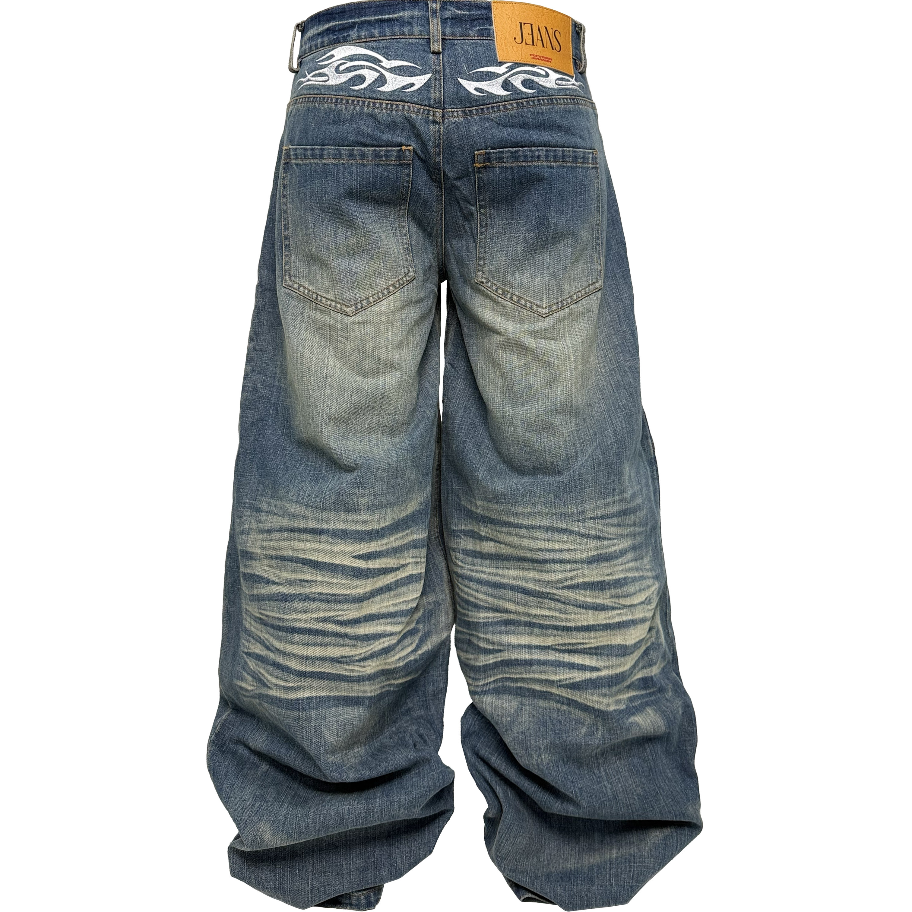 竹节纹拼接深蓝色水洗做旧baggy宽松牛仔裤 3MAN0N PCCVISION