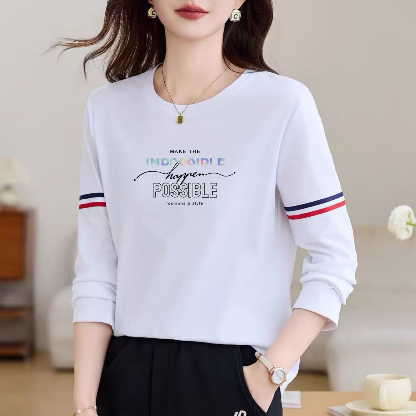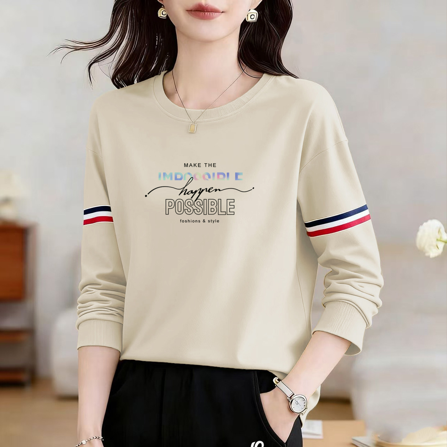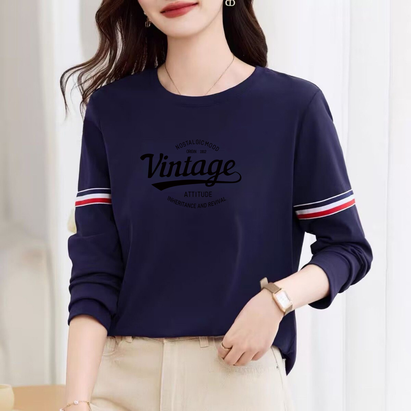 女装 卫衣女拼色全棉上衣打底衫 春季 T恤女纯棉时尚 潮 长袖 外贸正品