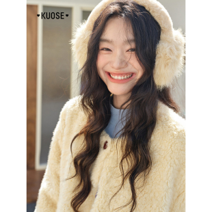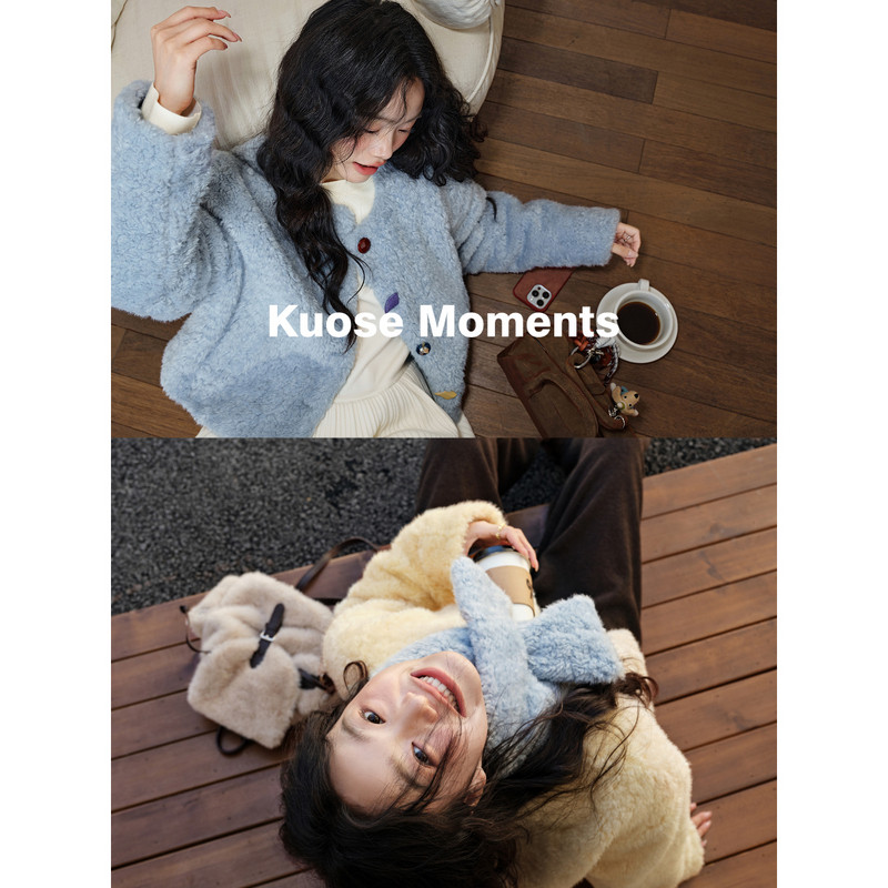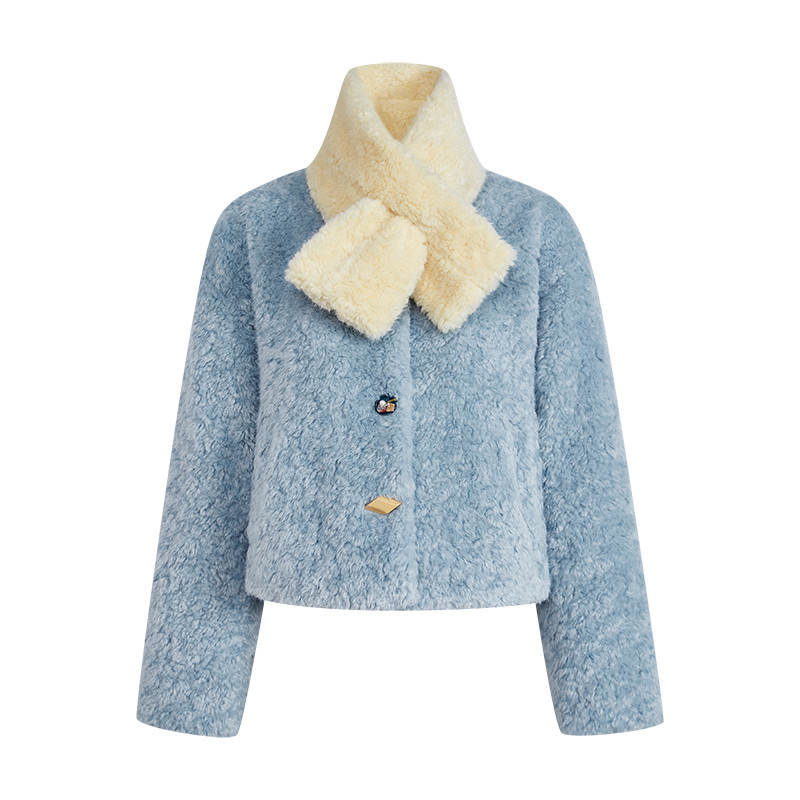 蓝色长袖 阔色浅黄色带围巾毛毛外套短款 女装 新款 上衣 2025秋冬季