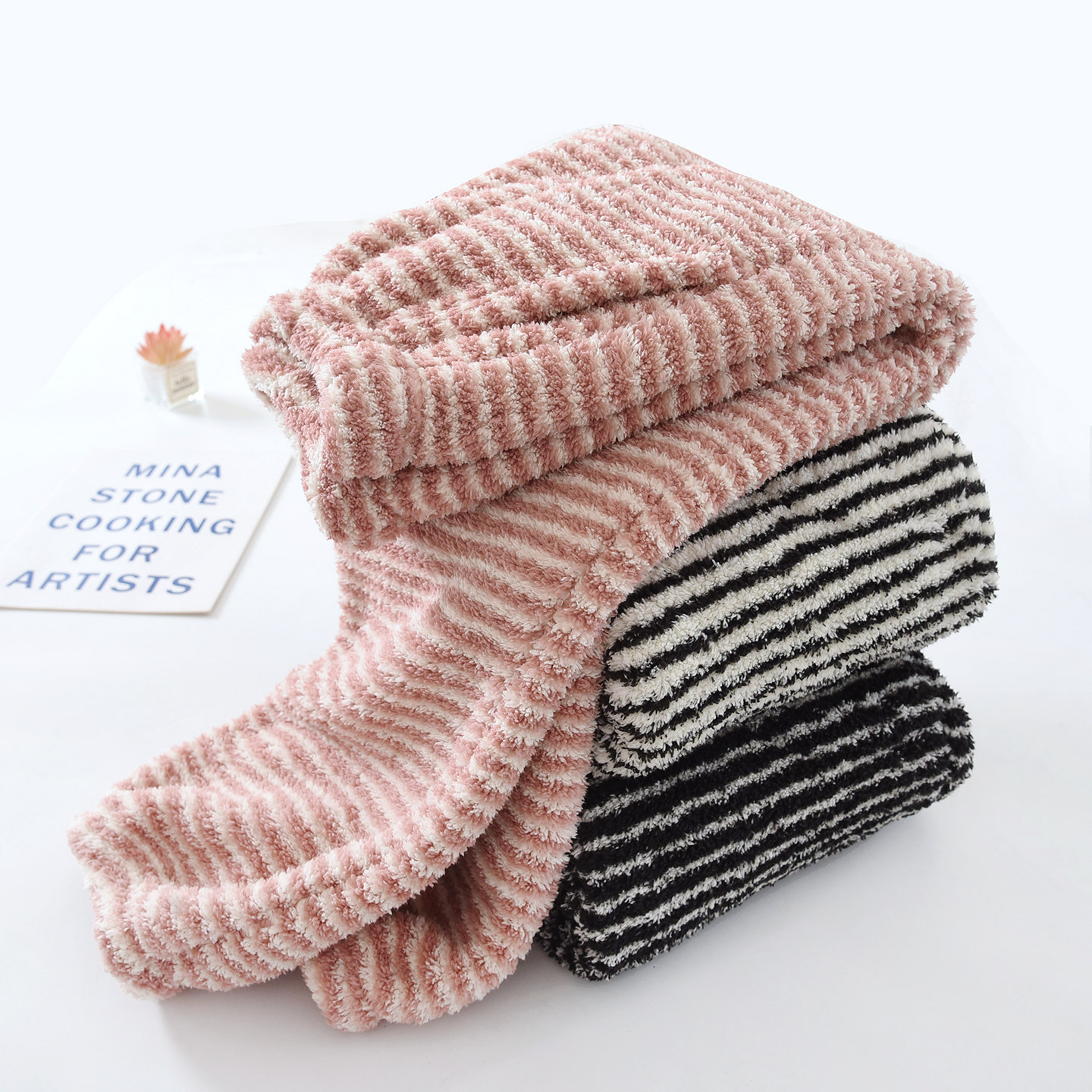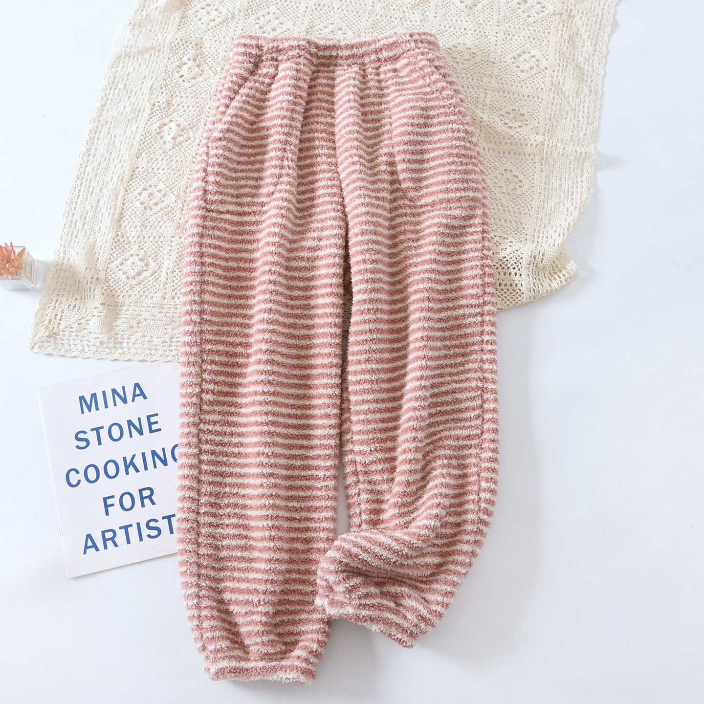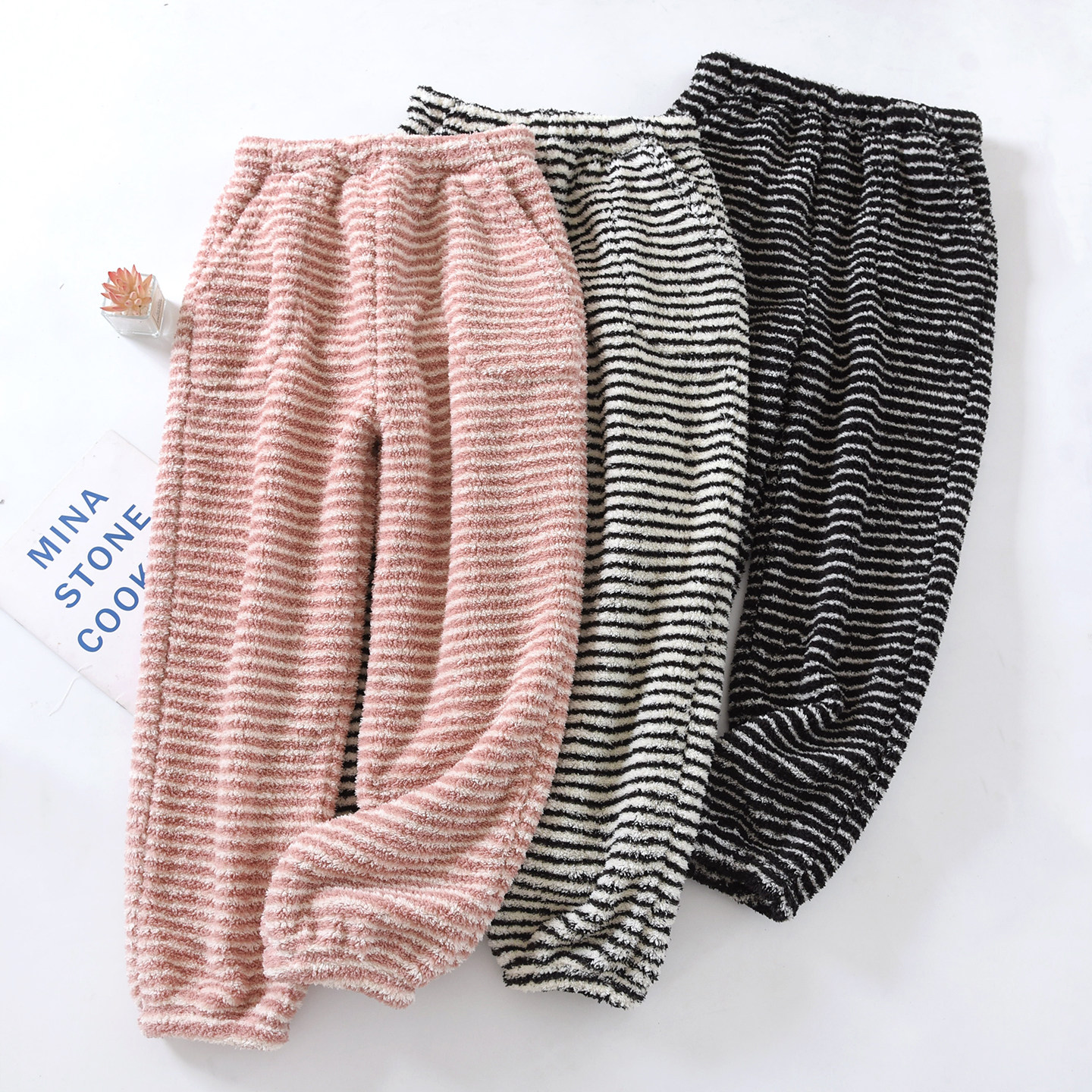可外穿宽松加绒加厚保暖法兰绒家居裤 日系条纹珊瑚绒睡裤 女士长裤