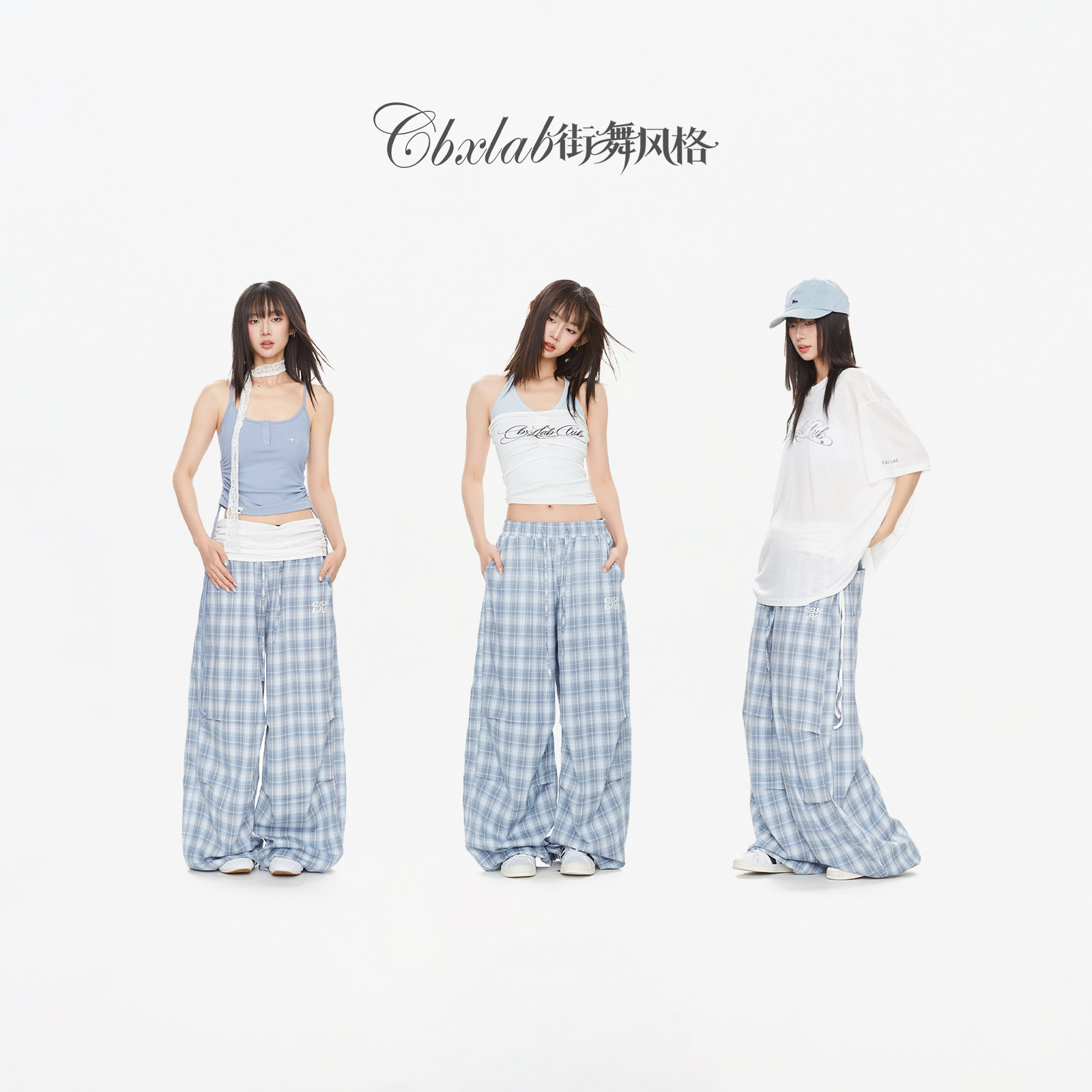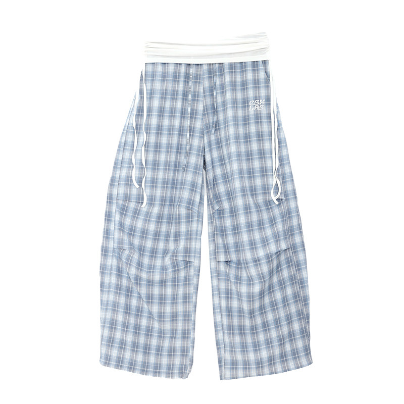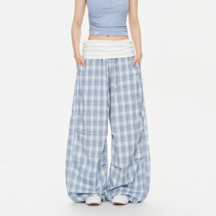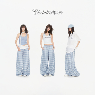 辣妹爵士长裤 CBXLAB街舞潮牌 美式 翻腰空气感格纹休闲裤 海盐雾蓝