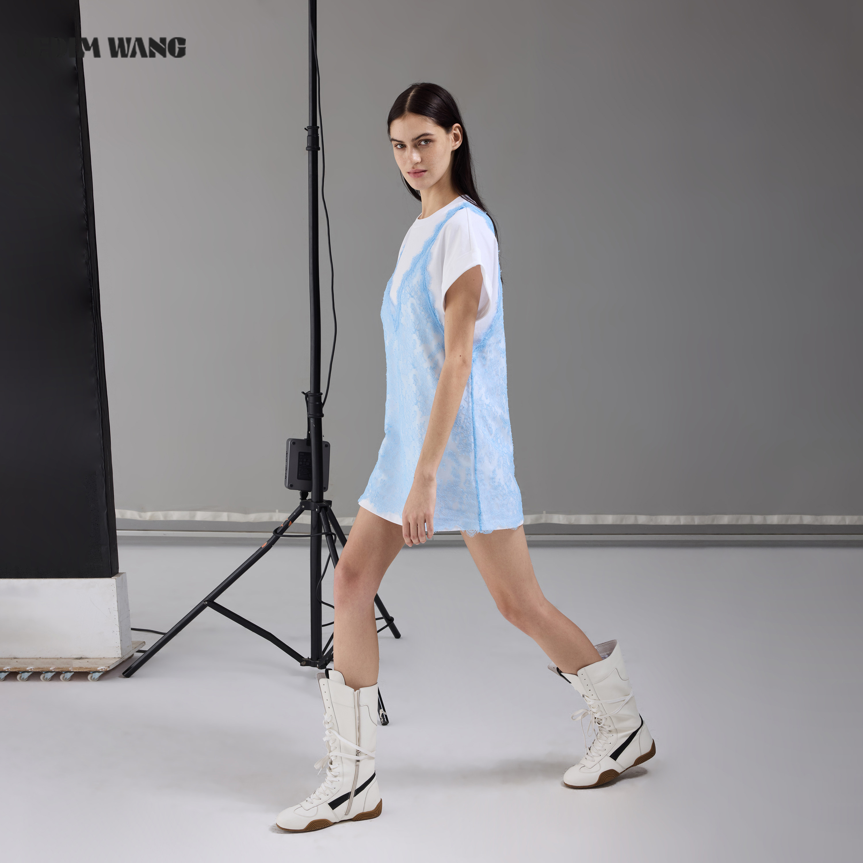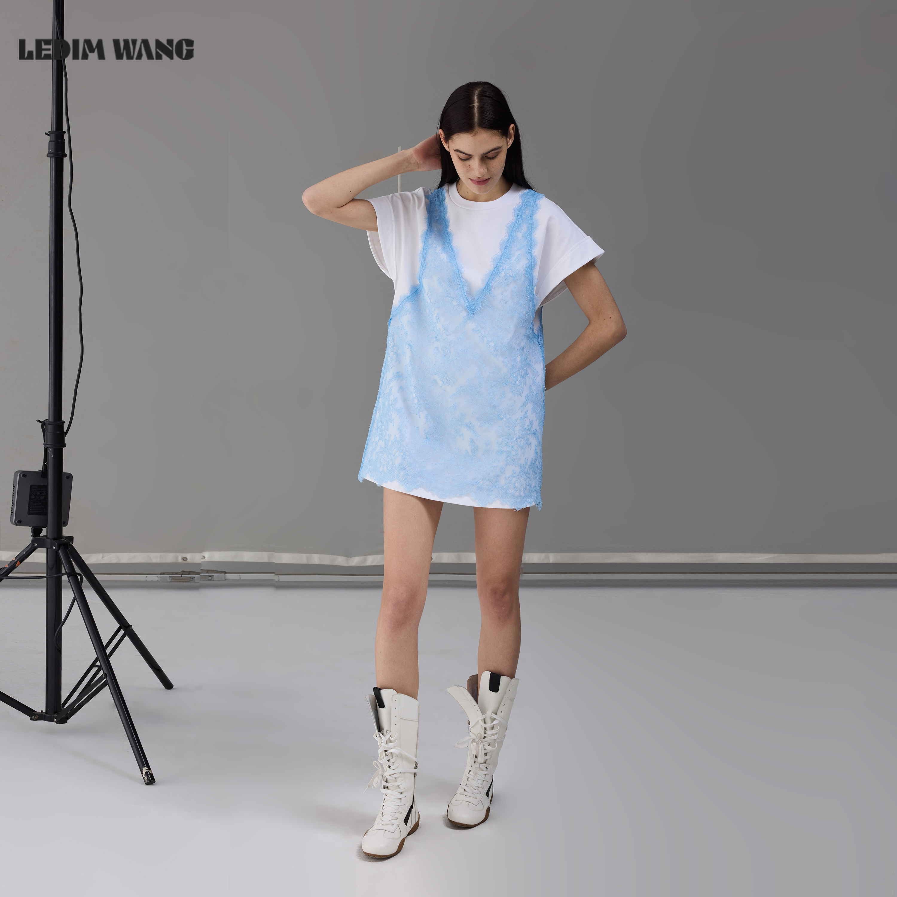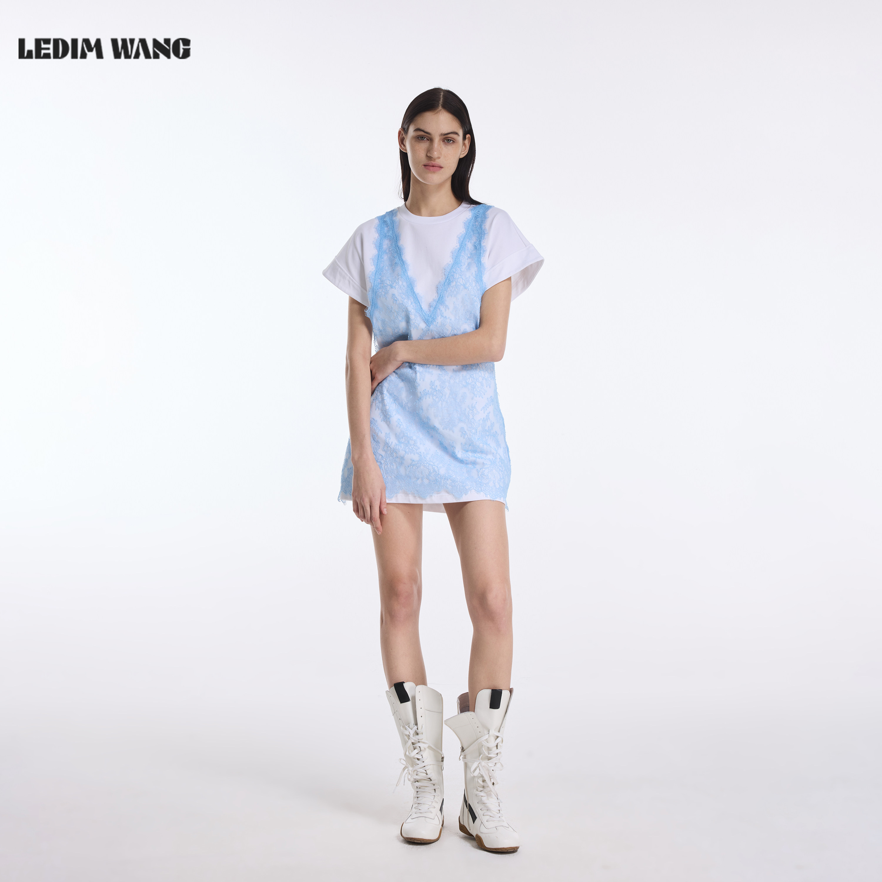 LEDIM 溪水蓝直筒短裙 WANG假两件蕾丝T恤裙连衣裙女2026春夏新款