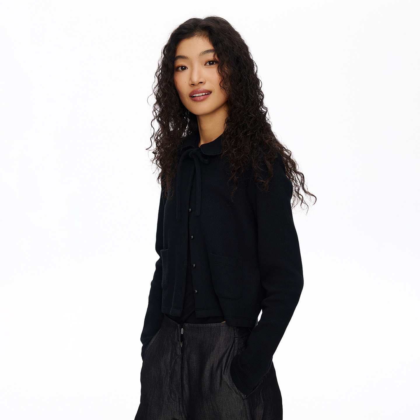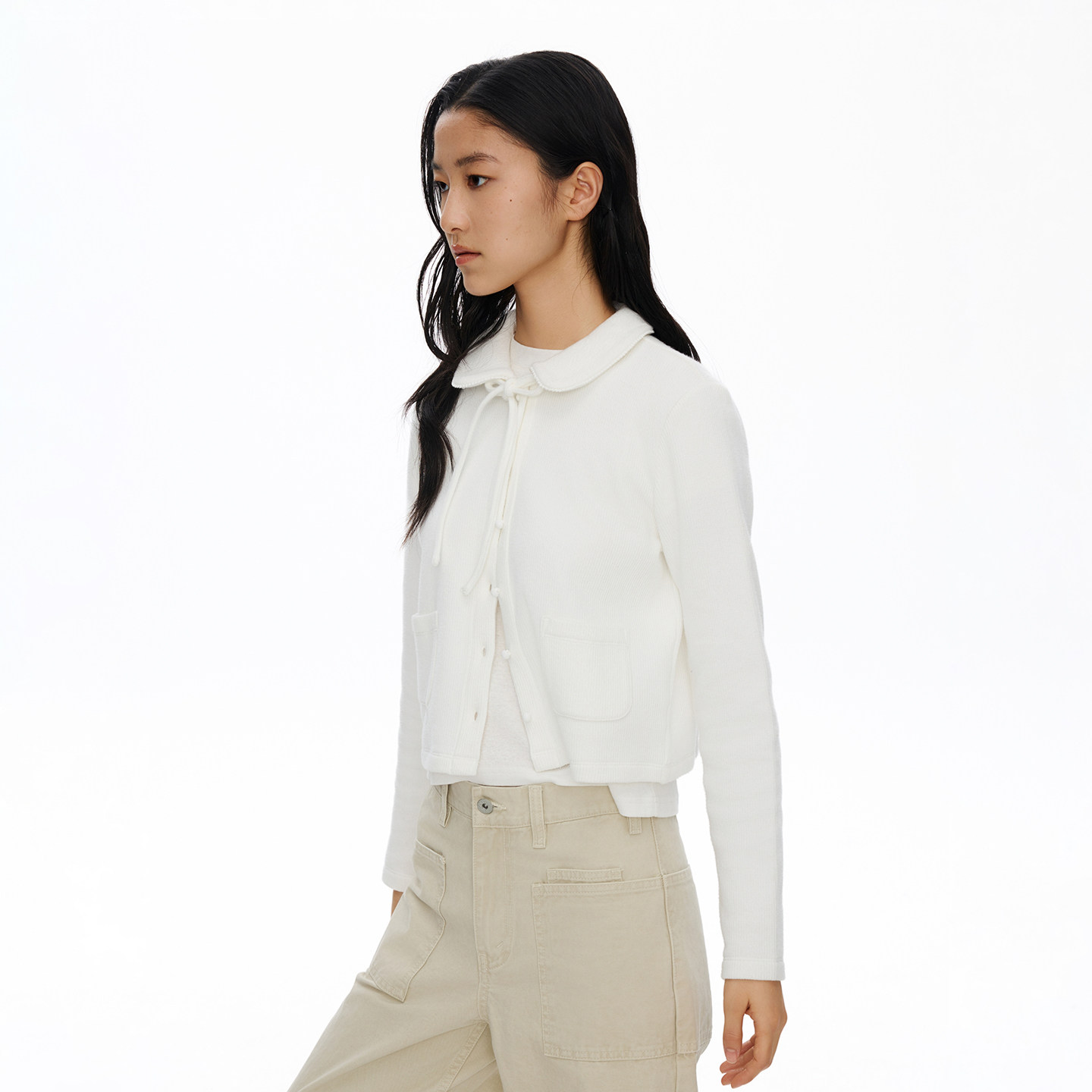外套女复古工装 oneup娃娃领短款 华夫格棉开衫 系带开衫 廓形 修身