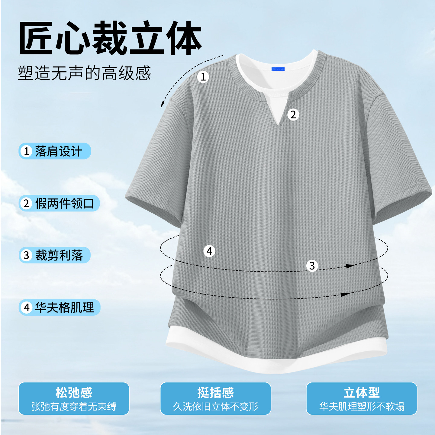 潮牌假两件上衣男华夫格透气男士 夏季 t恤X 男2026新款 马克华菲短袖