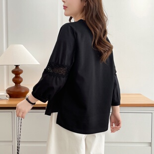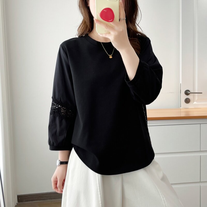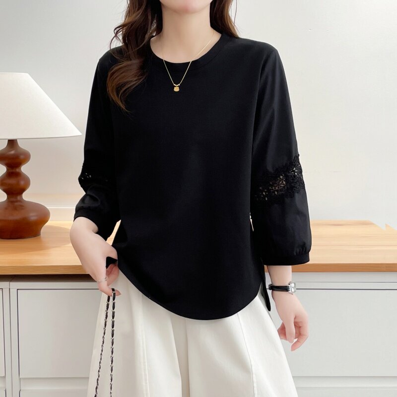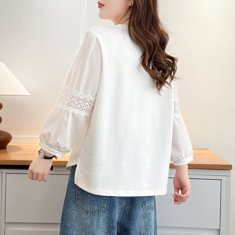 上衣 显瘦宽松上衣胖mm遮肚圆领七分袖 蕾丝镂空拼接灯笼袖 T恤大码