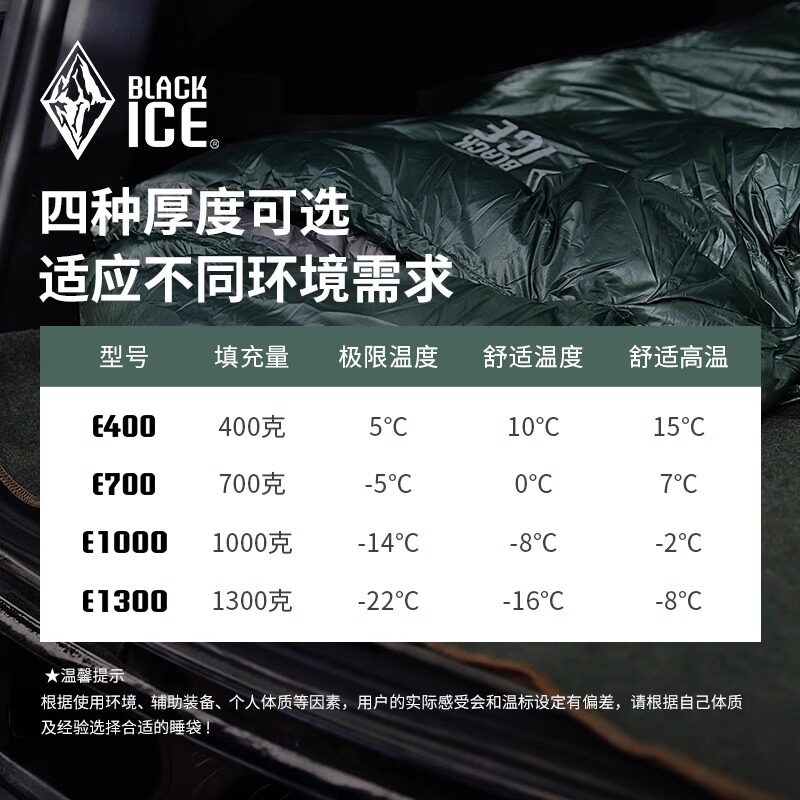 羽绒睡袋可拼接 E1000户外露营睡袋鹅绒信封式 黑冰E系列E400 E700