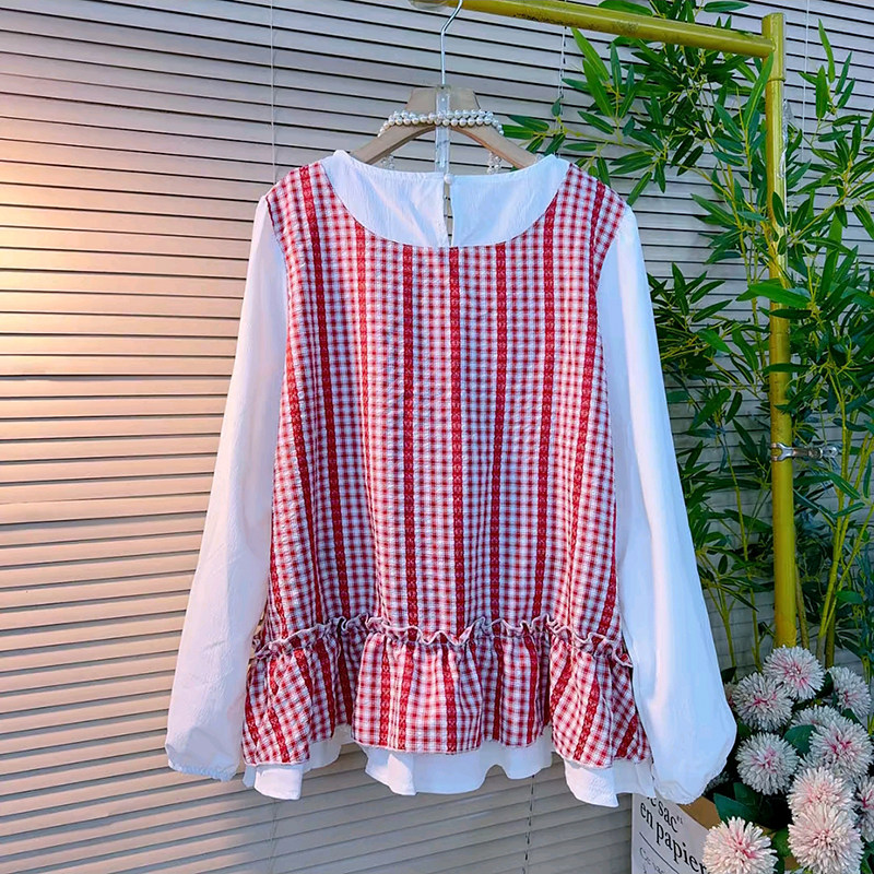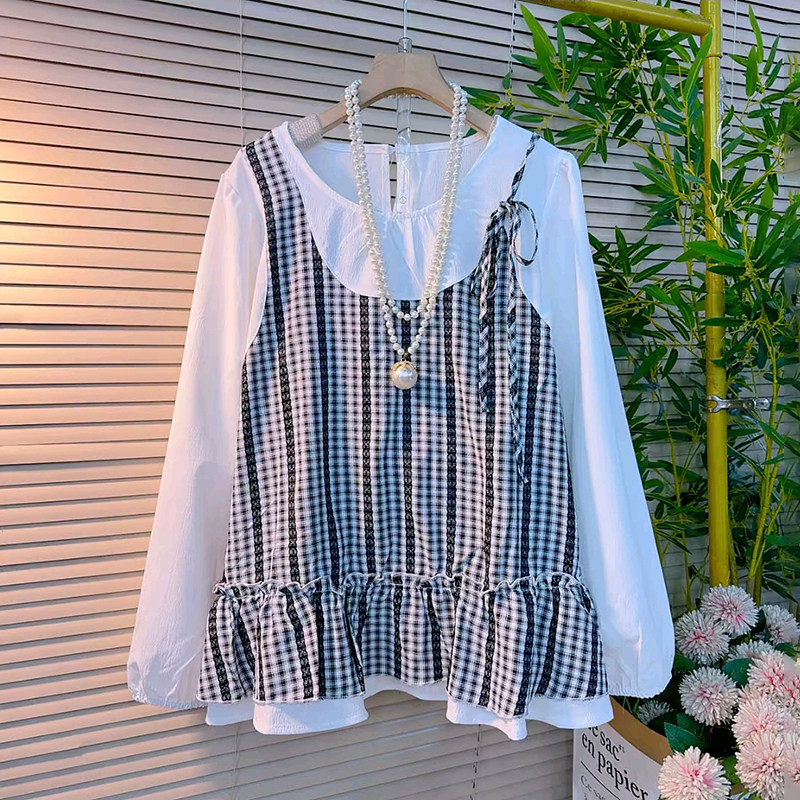 2026新款 春季 时尚 假两件韩版 胖妹妹大码 荷叶边拼色减龄百搭衫 女装