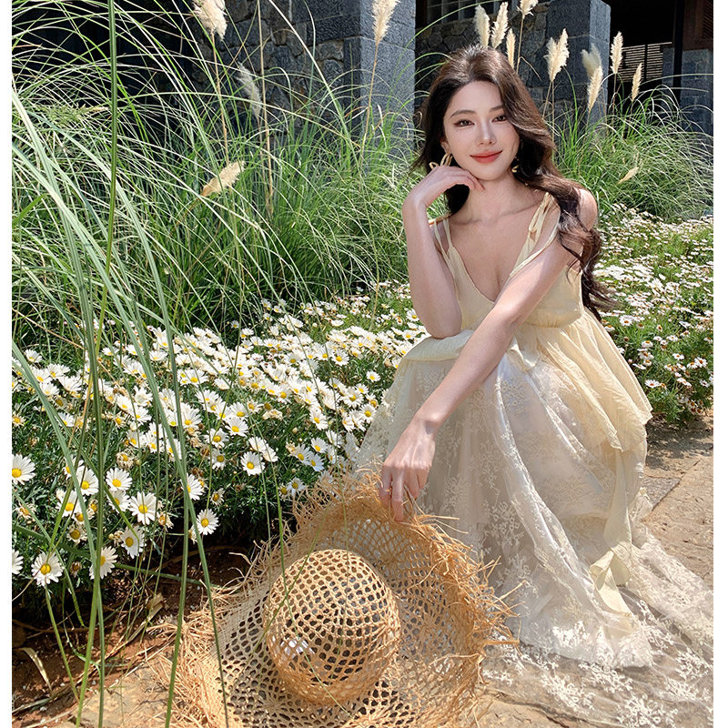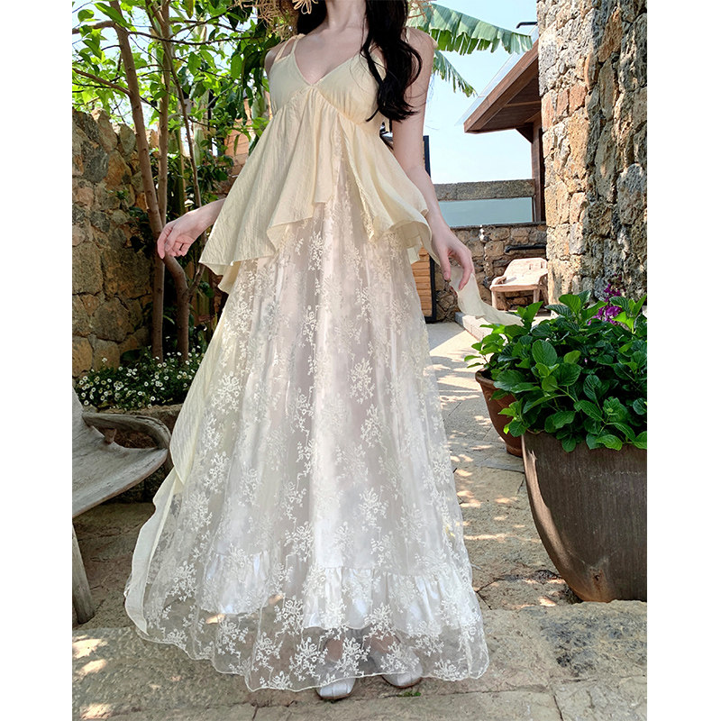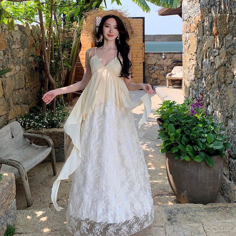 实拍仙德瑞拉浪漫重工刺绣吊带长裙V领蕾丝拼接仙仙裙长裙