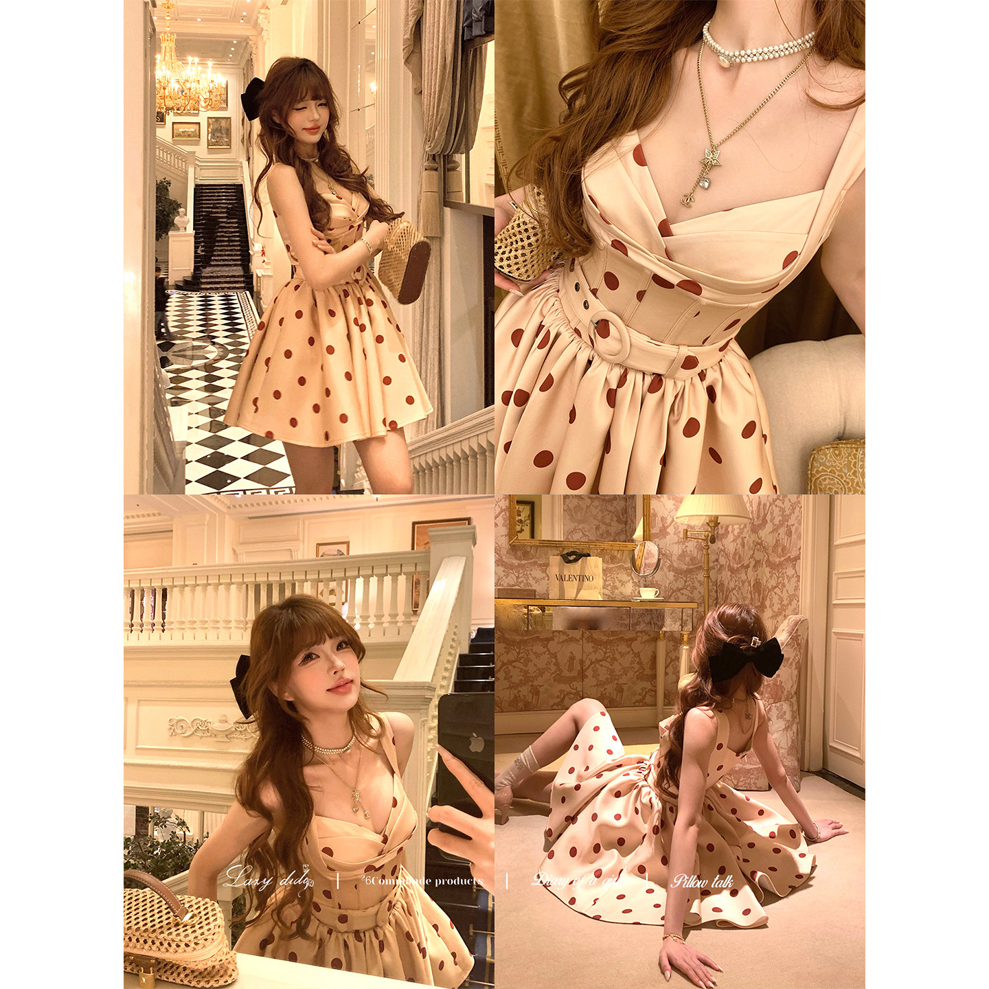 Lazy 复古波点蓬蓬连衣裙缎面显瘦吊带裙含腰带 Didi爱尔兰序曲