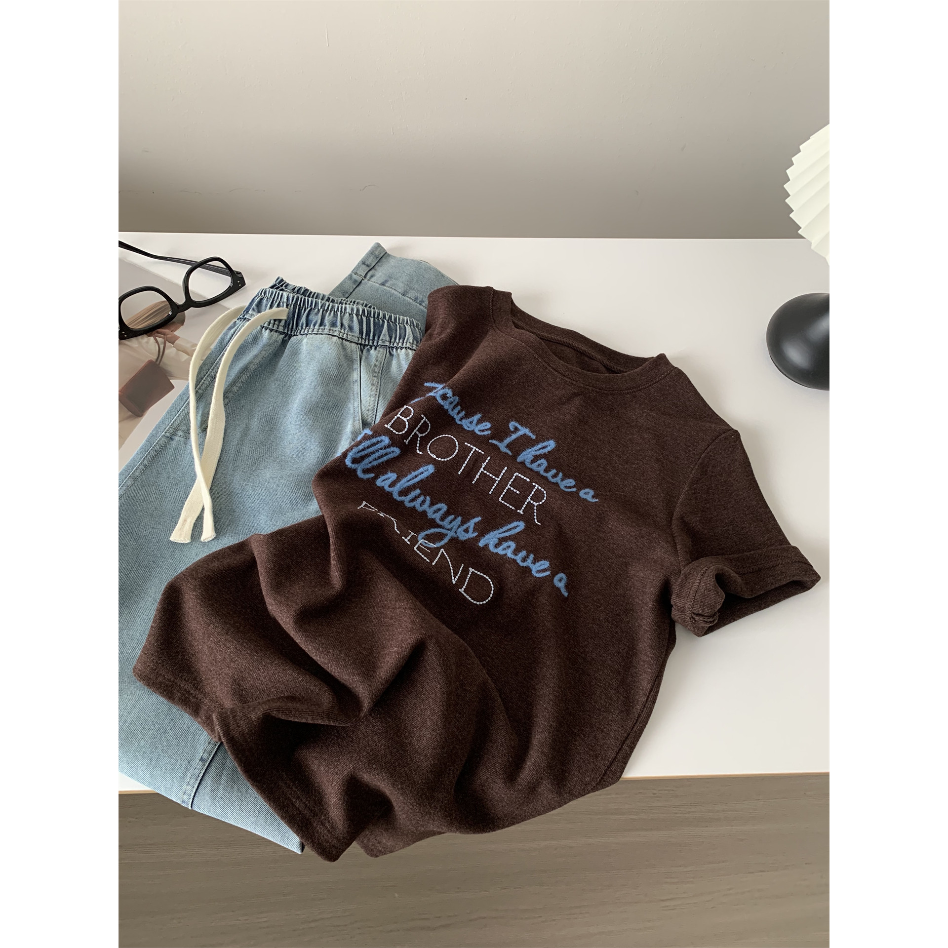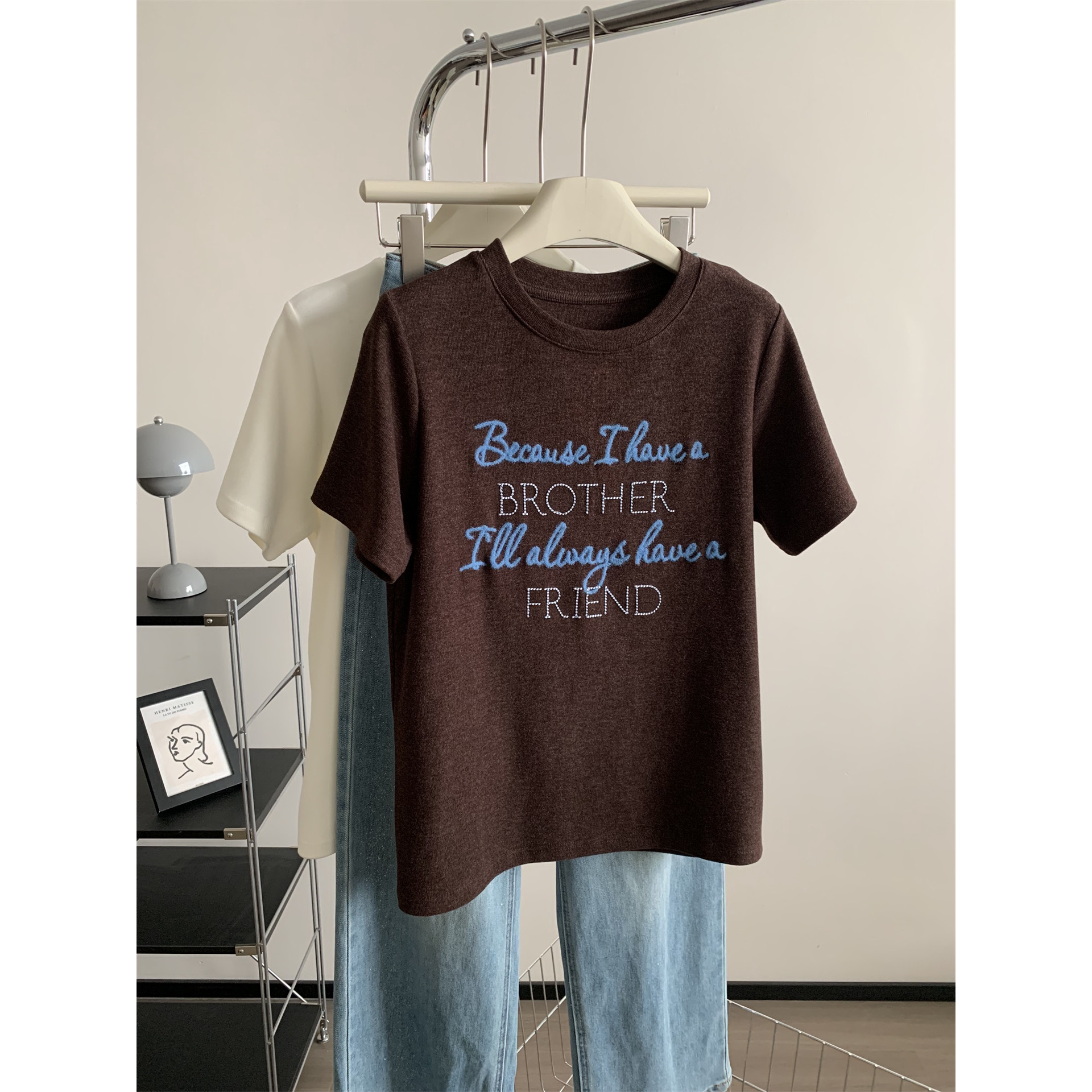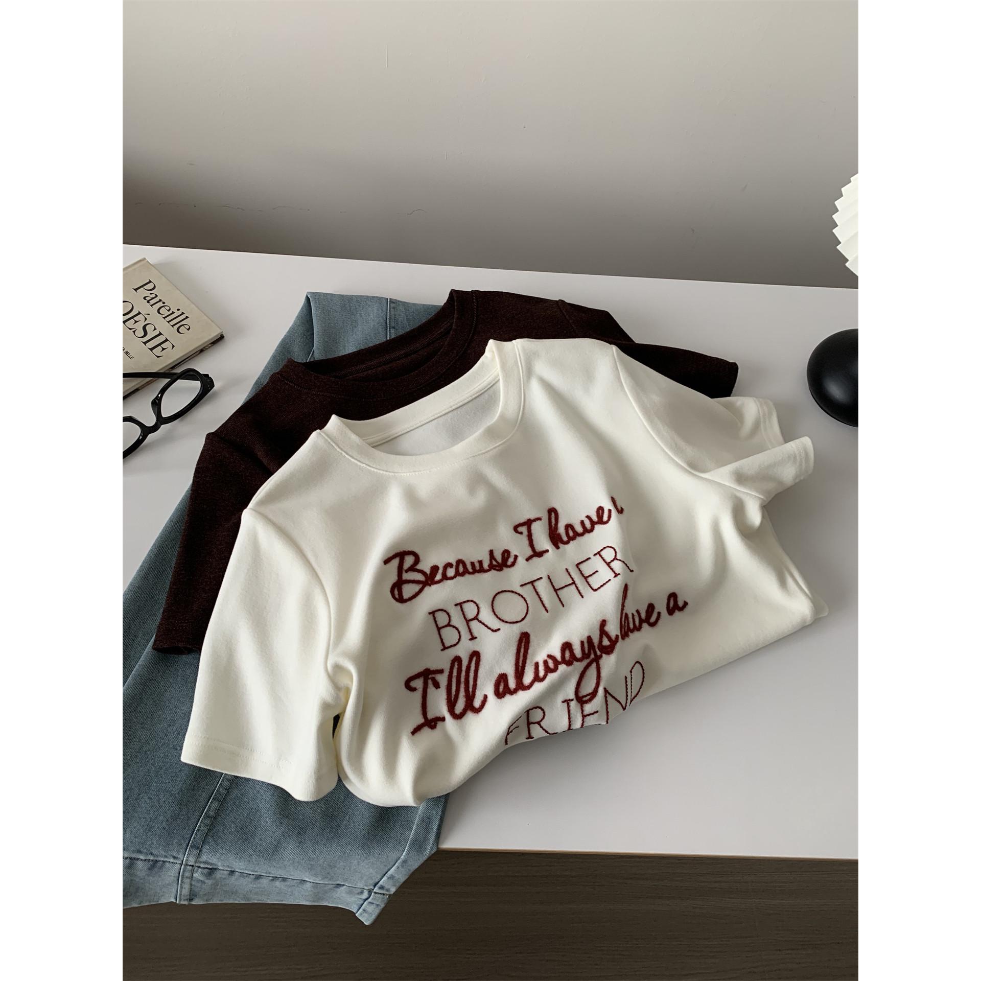百搭显瘦正肩T恤 新款 显白复古字母刺绣圆领磨毛短袖 女2026春秋季