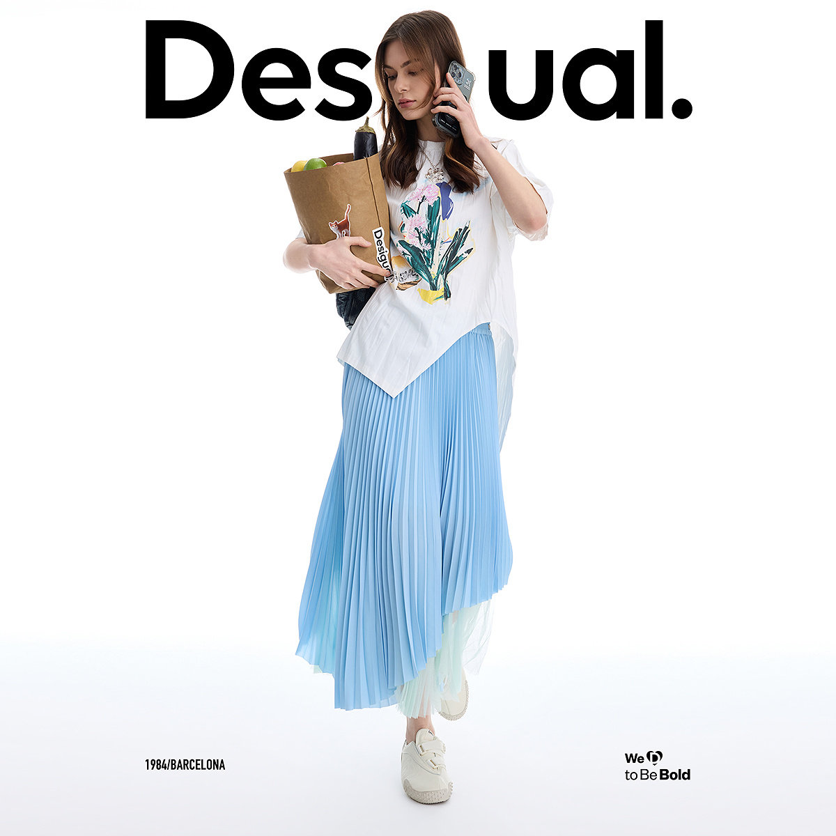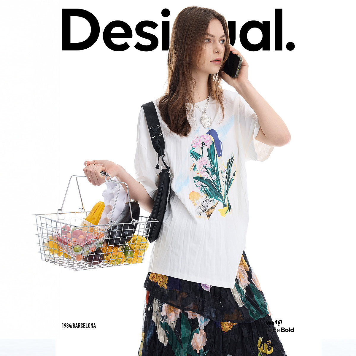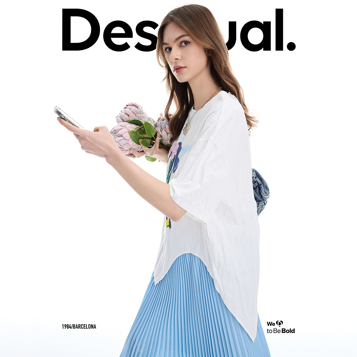 女式 短袖 T恤 宽松印花压皱不规则下摆长款 Desigual26春夏新品