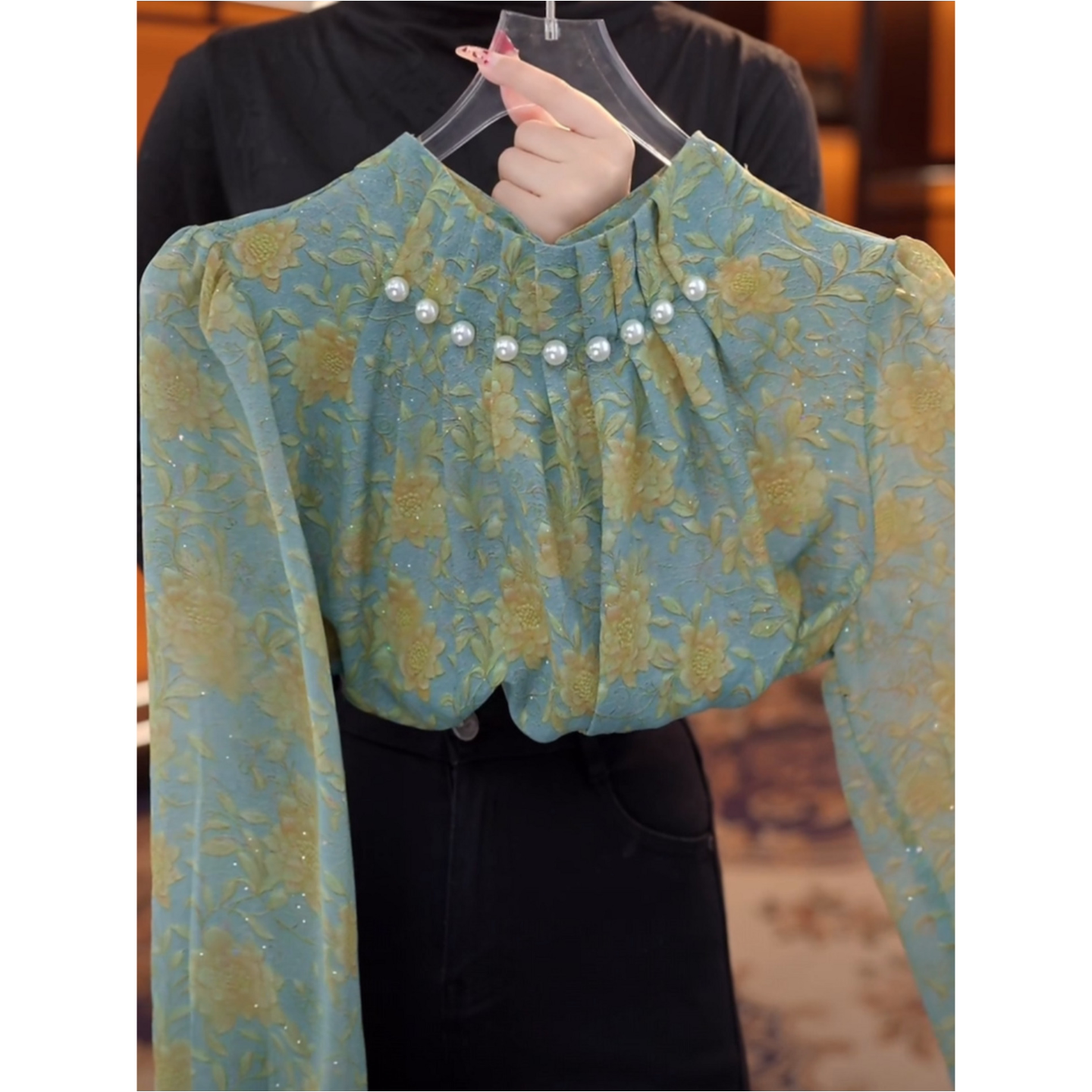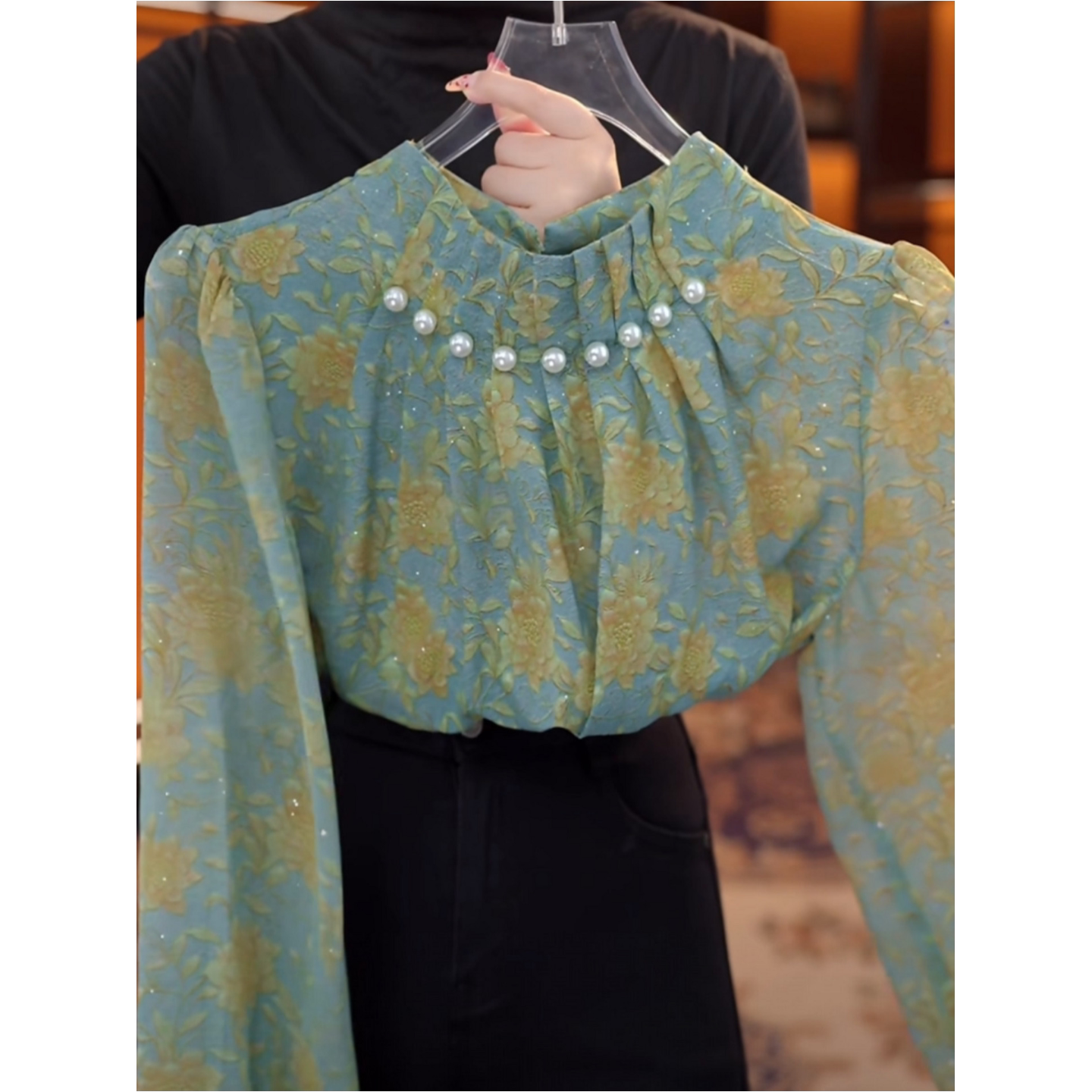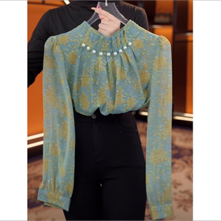 上衣 小衫 春秋高级感绿色碎花衬衫 女气质钉珠设计立领减龄百搭长袖