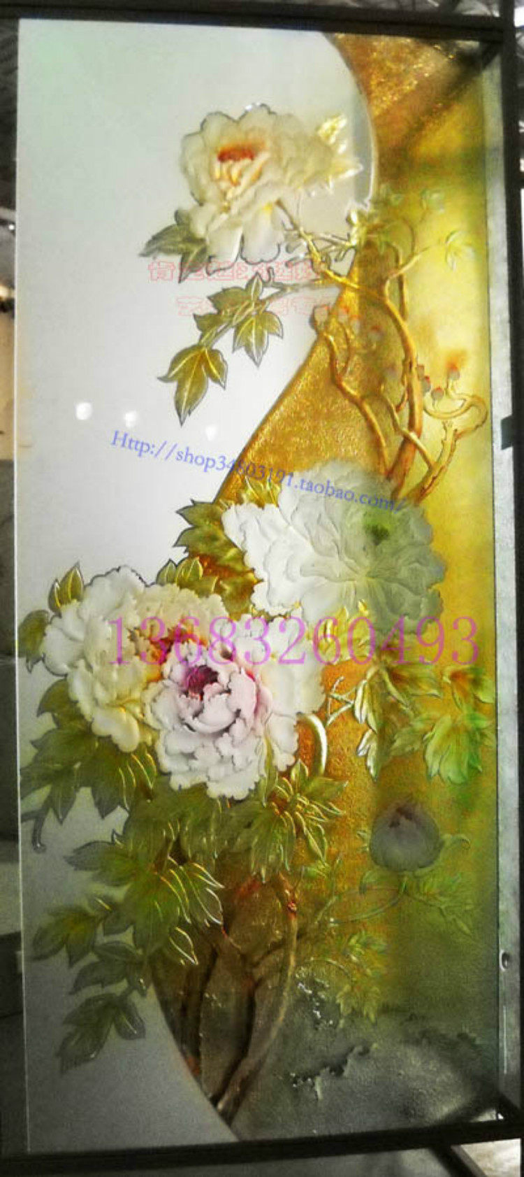 定做钢化中式 雕刻艺术玻璃电视背景墙饰屏风隔断玄关门牡丹半遮面