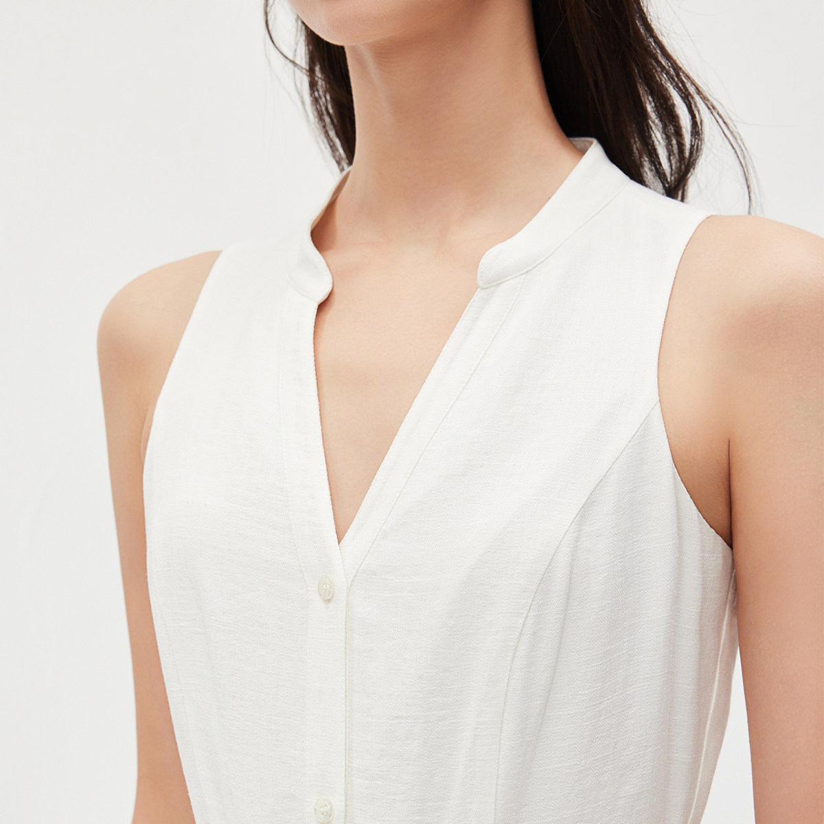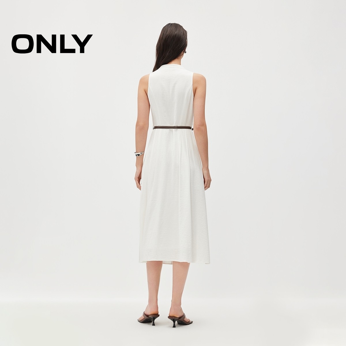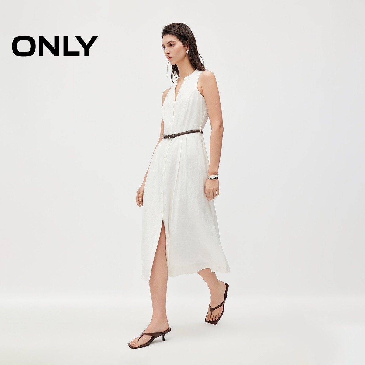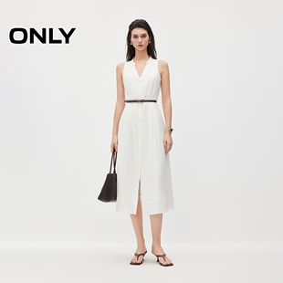ONLY2026春季 裙子含亚麻腰部捏褶同色排扣白色长裙连衣裙女 新款